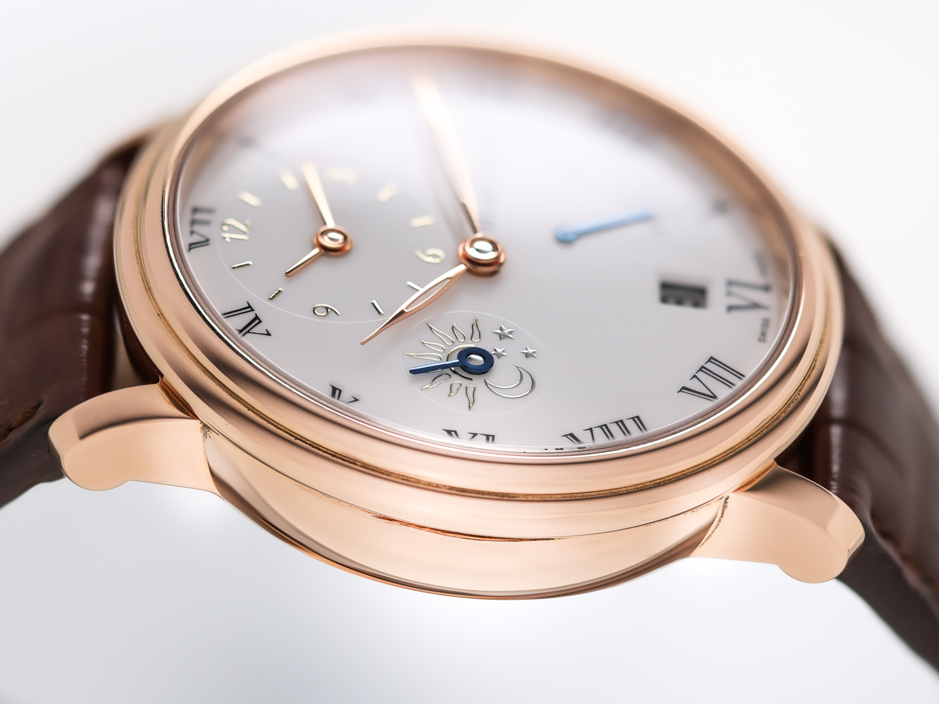 The 40 mm case is rendered in solid 18k rose gold, offering a warm and distinguished presence on the wrist. Its slim profile, stepped bezel, and signature Villeret case design reflect the brand’s classical aesthetic and commitment to timeless proportions.