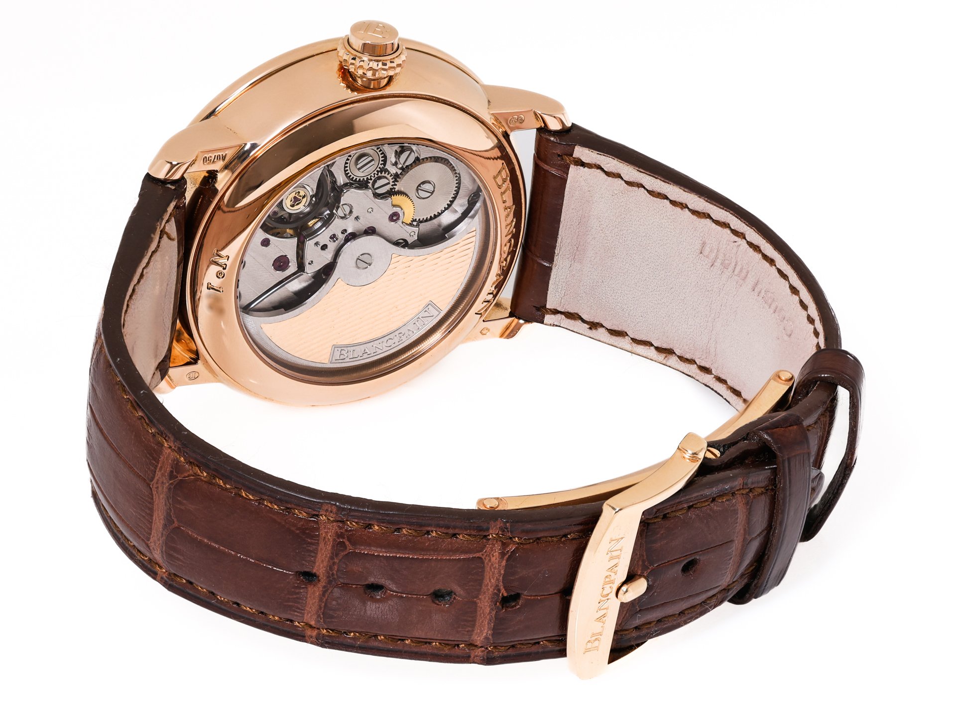 At the heart of the watch beats a finely crafted automatic movement developed in-house by Blancpain. Offering an exceptional power reserve of approximately 8 days, the movement is visible through the sapphire case back and features refined finishing in line with the brand’s high horological standards.