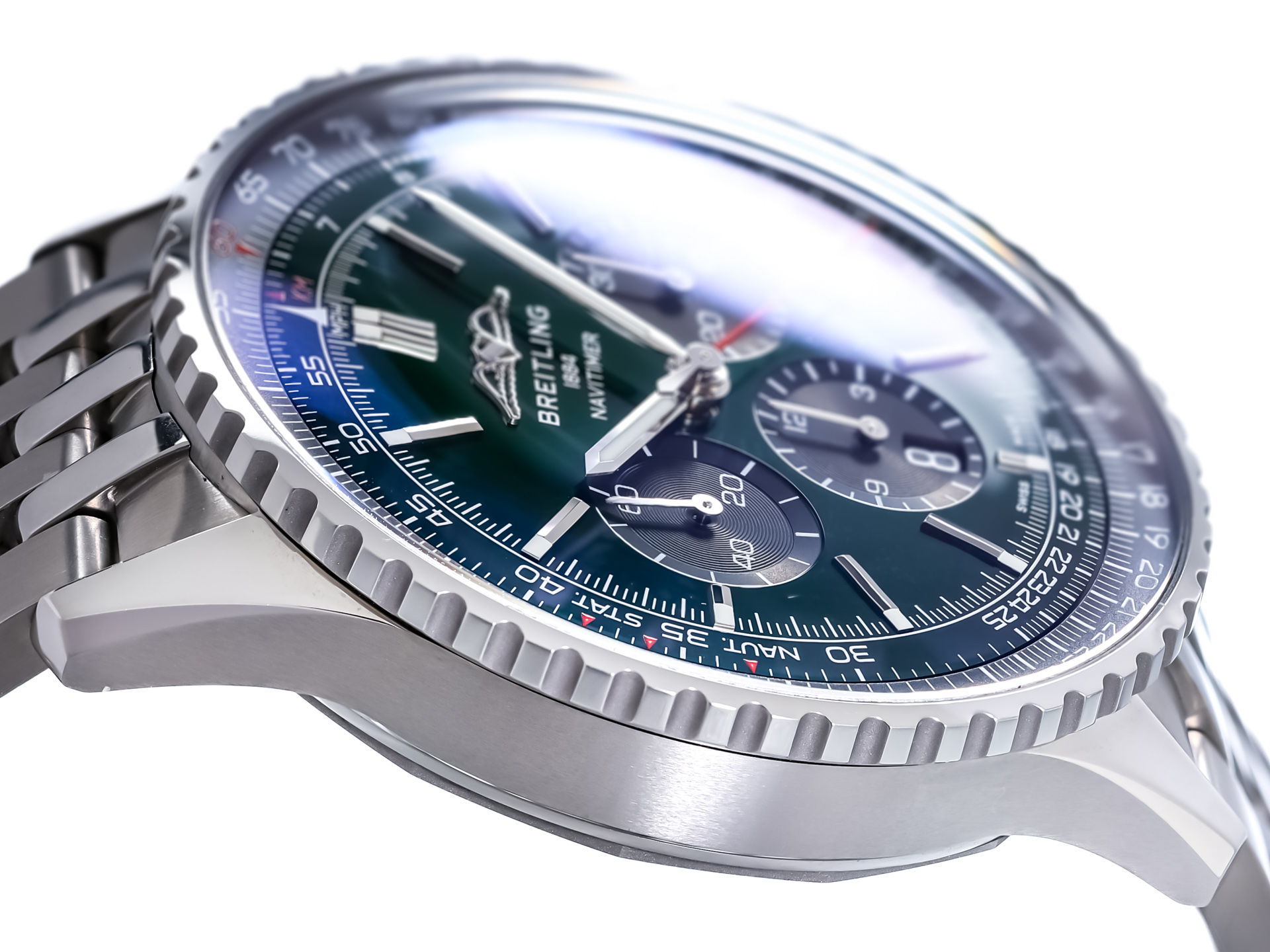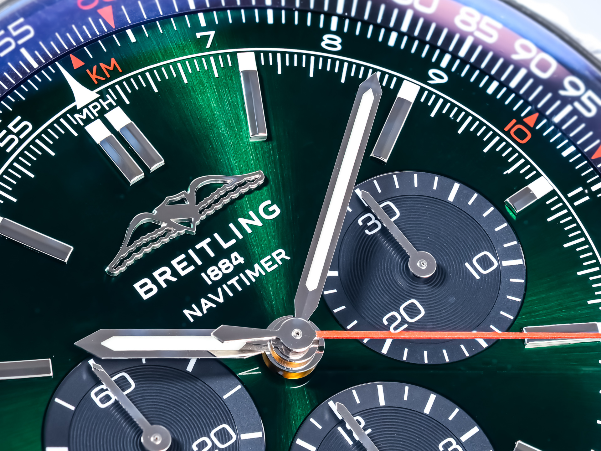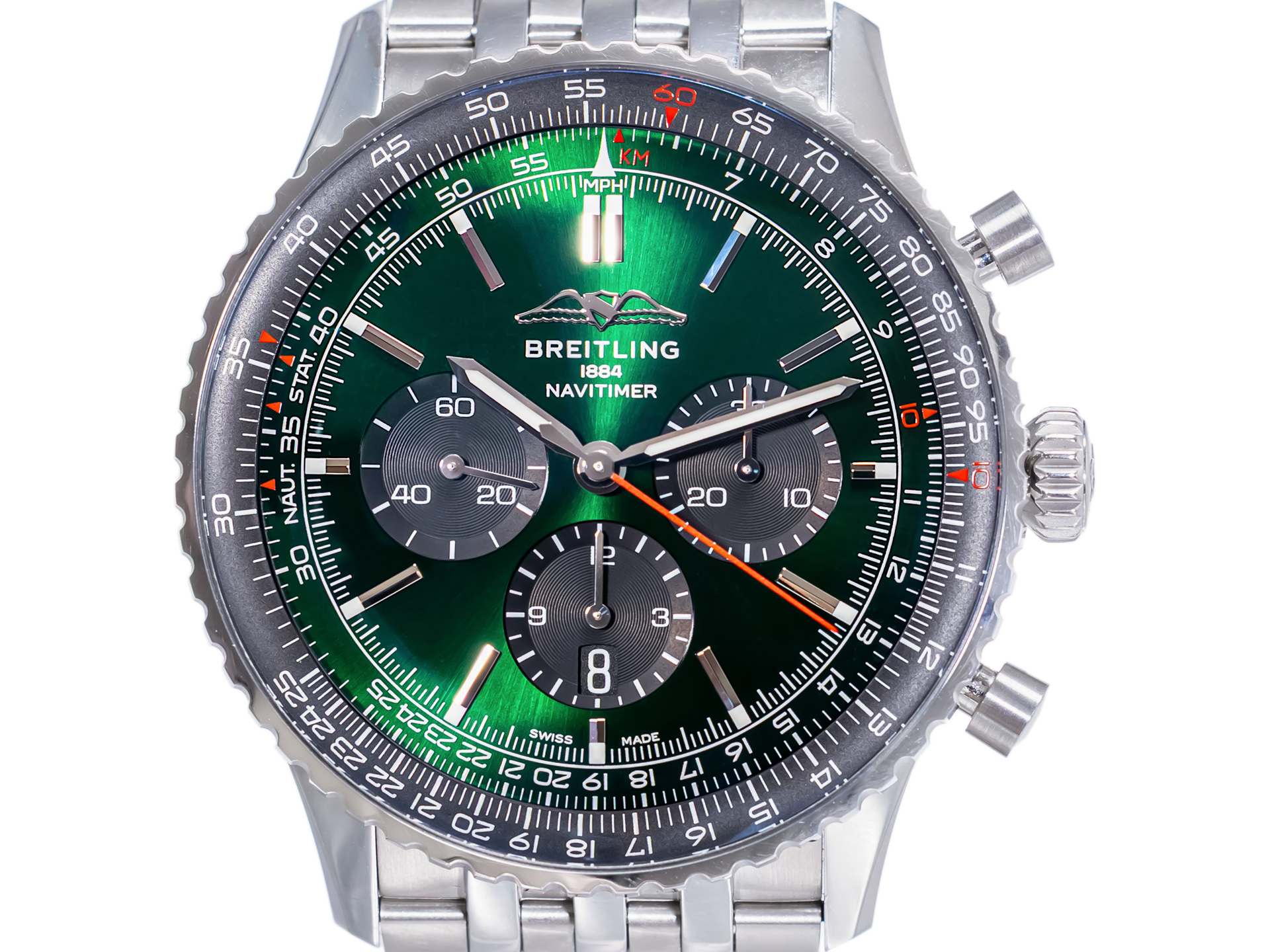 Featuring a striking green-black dial, this 46 mm Navitimer offers a bold yet refined presence on the wrist. The watch is powered by Breitling’s in-house Calibre B01 automatic chronograph movement, renowned for its precision, reliability, and impressive 70-hour power reserve.