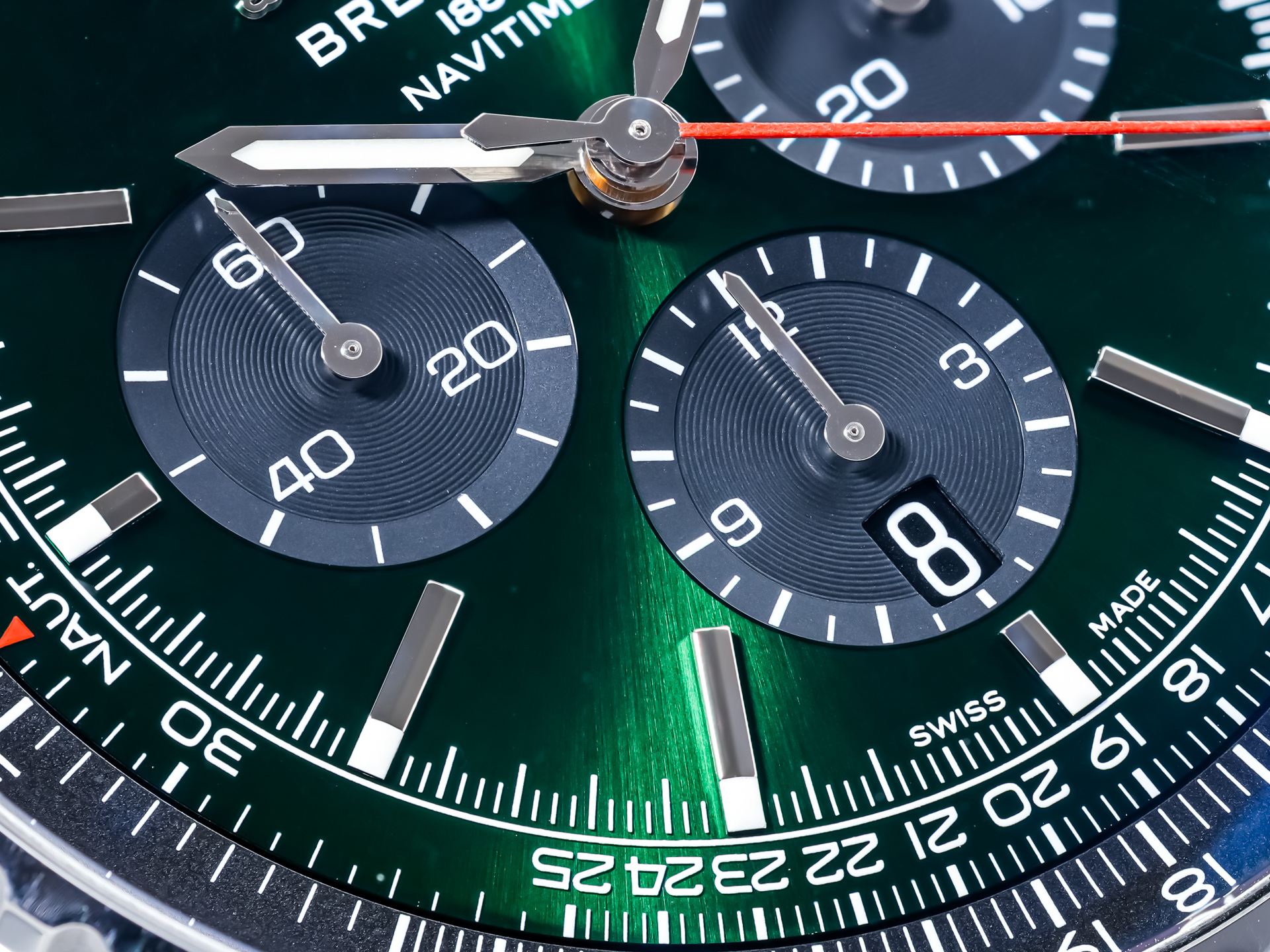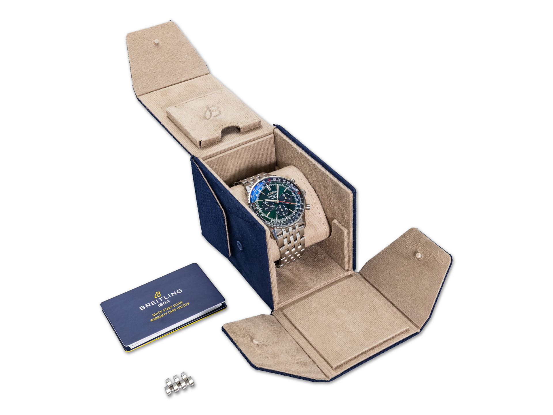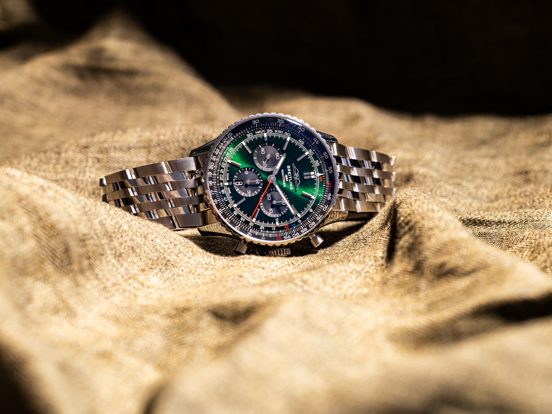 Featuring a striking green-black dial, this 46 mm Navitimer offers a bold yet refined presence on the wrist. The watch is powered by Breitling’s in-house Calibre B01 automatic chronograph movement, renowned for its precision, reliability, and impressive 70-hour power reserve.