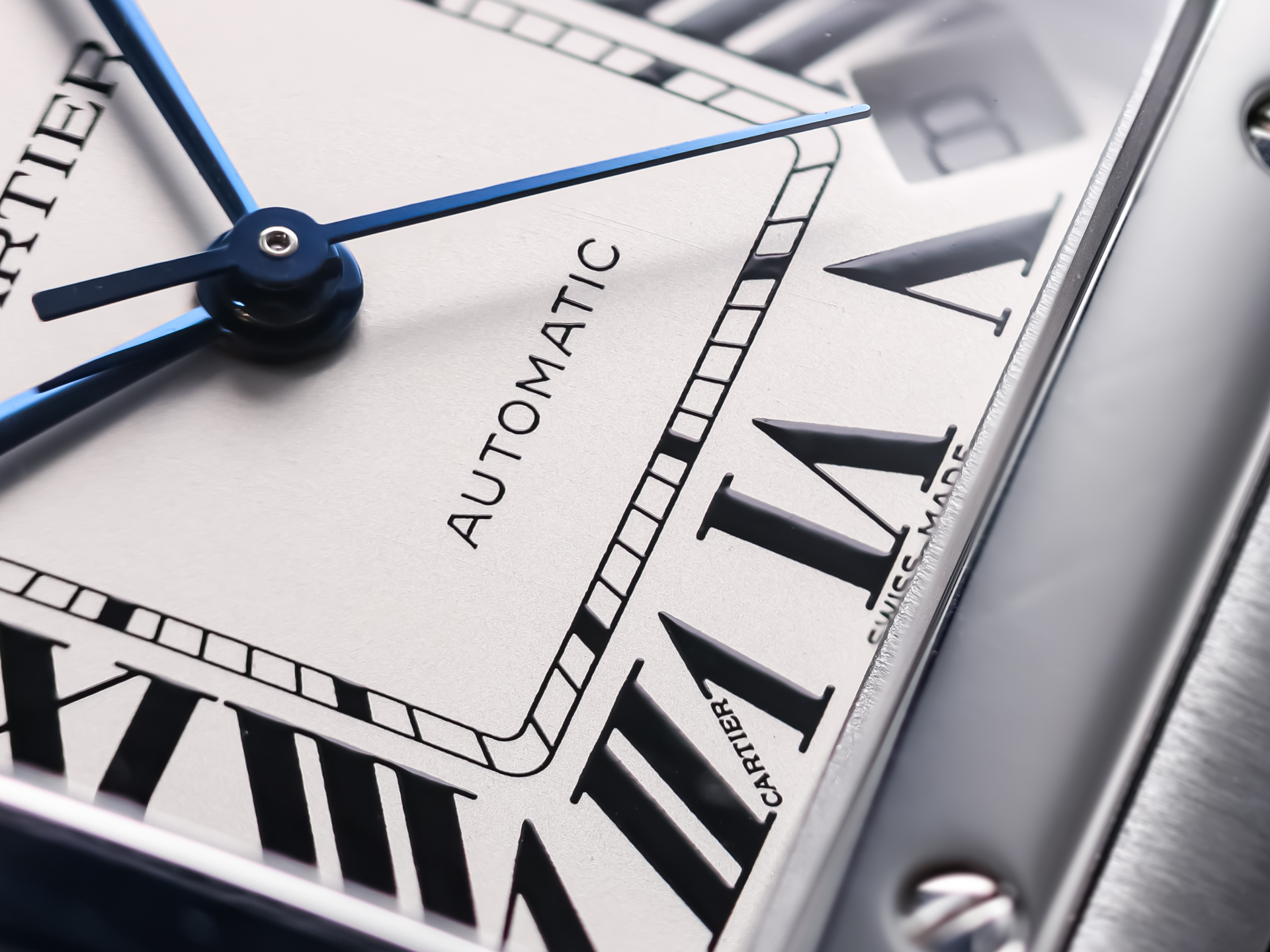 The silvered dial is adorned with Cartier’s signature Roman numerals and blued steel hands, complemented by a date aperture at 3 o’clock for practical daily use. The combination of polished and brushed finishes highlights the watch’s architectural design while maintaining a clean, balanced aesthetic.