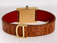 The watch is fitted with a high-quality Cartier leather strap and matching 18k yellow gold Cartier folding clasp, offering both security and elegance on the wrist.