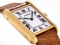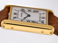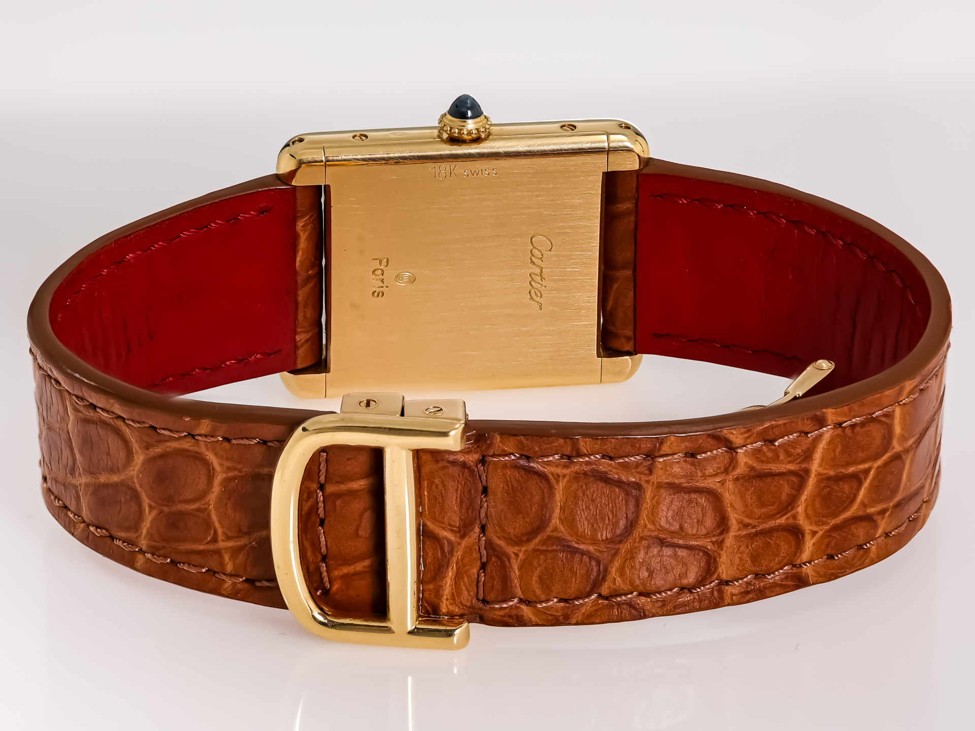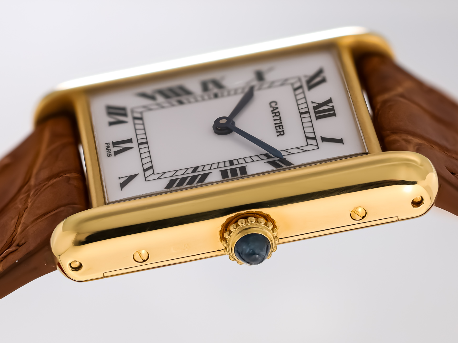 The warm 18k yellow gold case is gracefully proportioned, paired with Cartier’s classic silvered opaline dial featuring Roman numerals, an inner rail-track minute scale, and blued steel sword-shaped hands — all design signatures of the maison’s storied Tank lineage.
