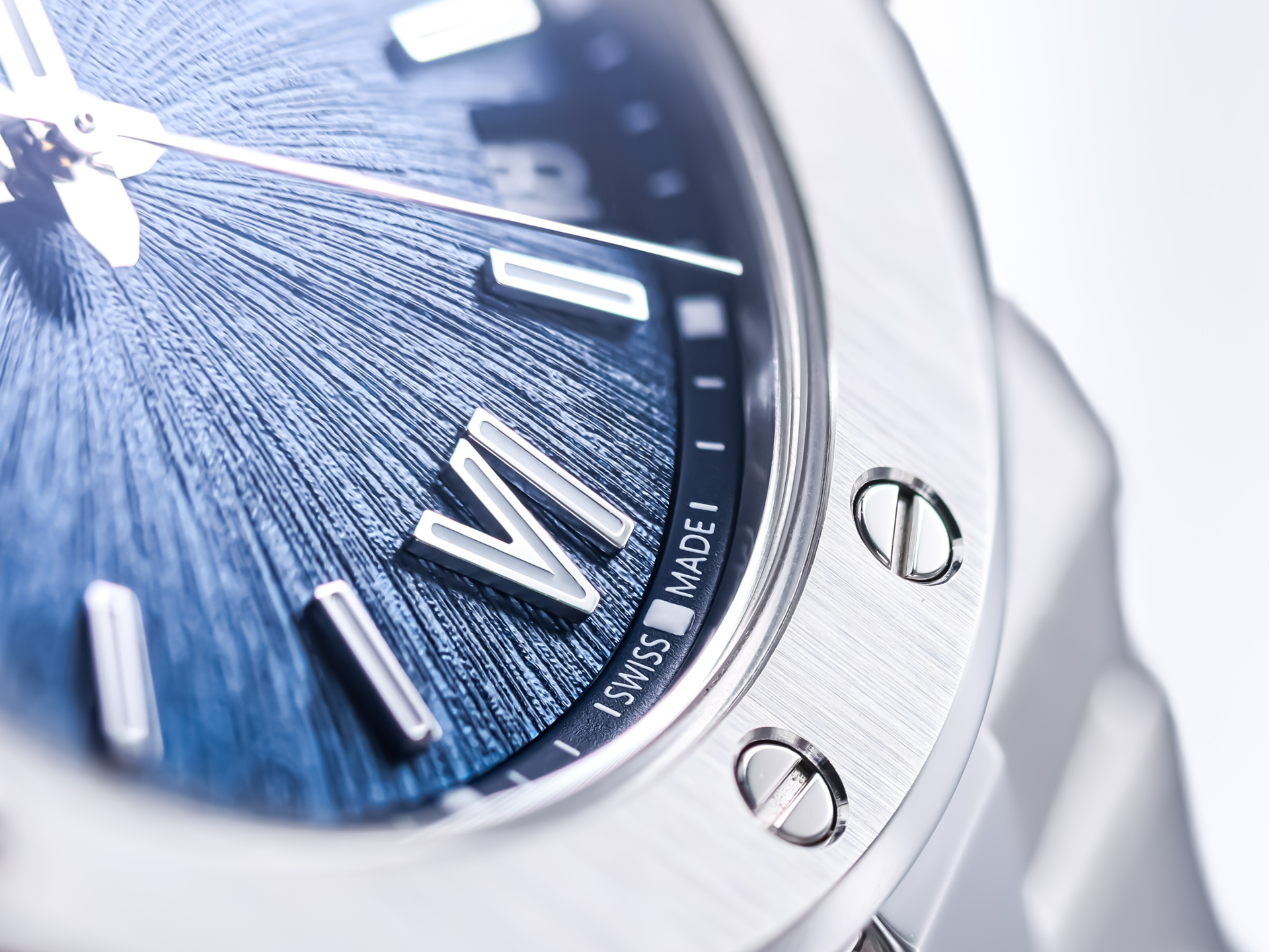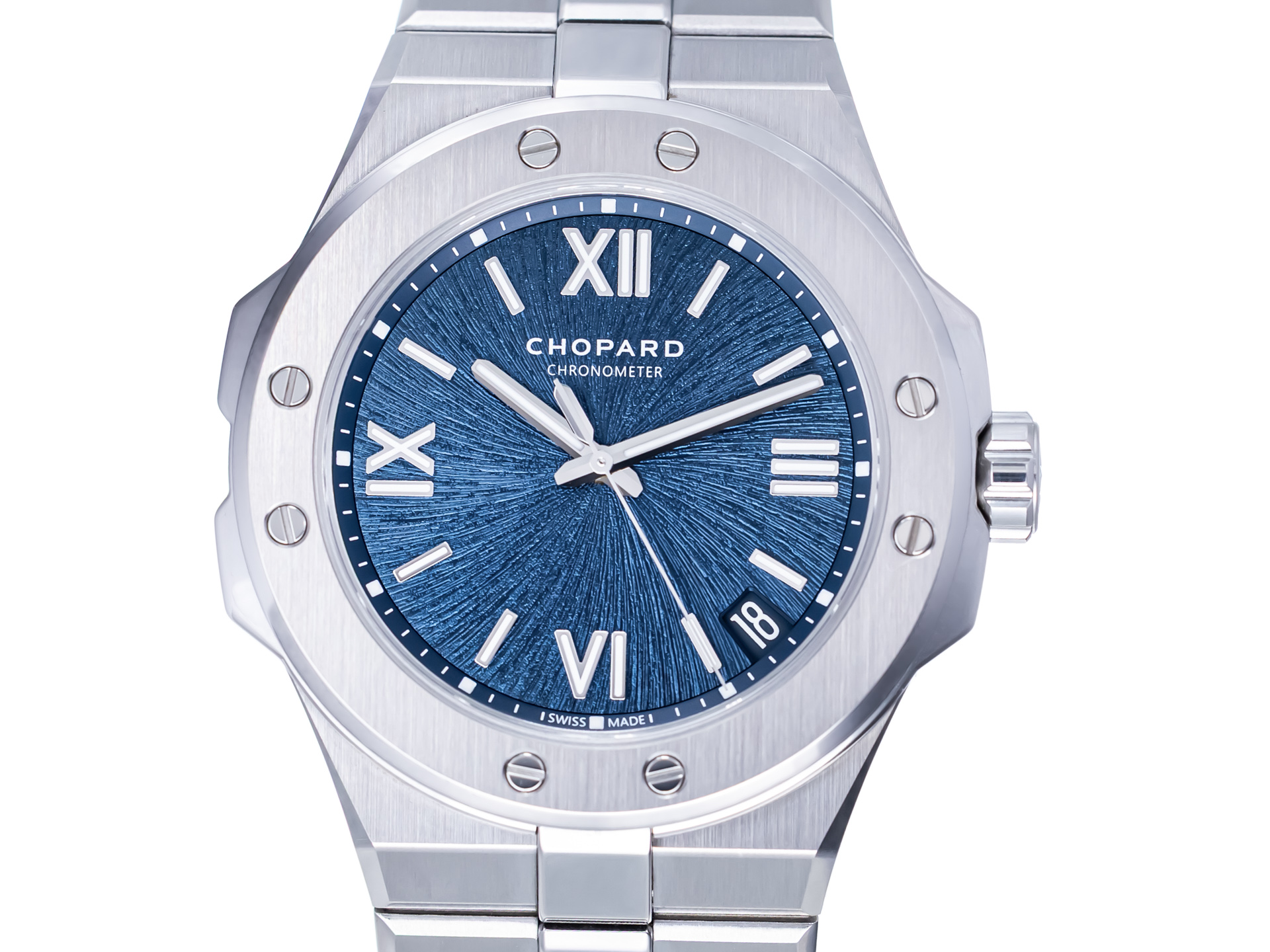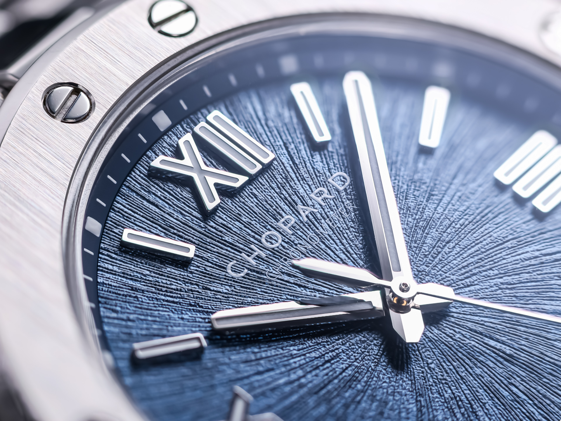 The 41 mm case, made from Chopard's own Lucent Steel A223, offers remarkable brilliance and durability. The vertically brushed bezel is secured with eight functional screws in a compass rose orientation – a characteristic design feature of the Alpine Eagle. The integrated bracelet flows seamlessly into the case and is finished with a sophisticated mix of satin-brushed and polished surfaces.