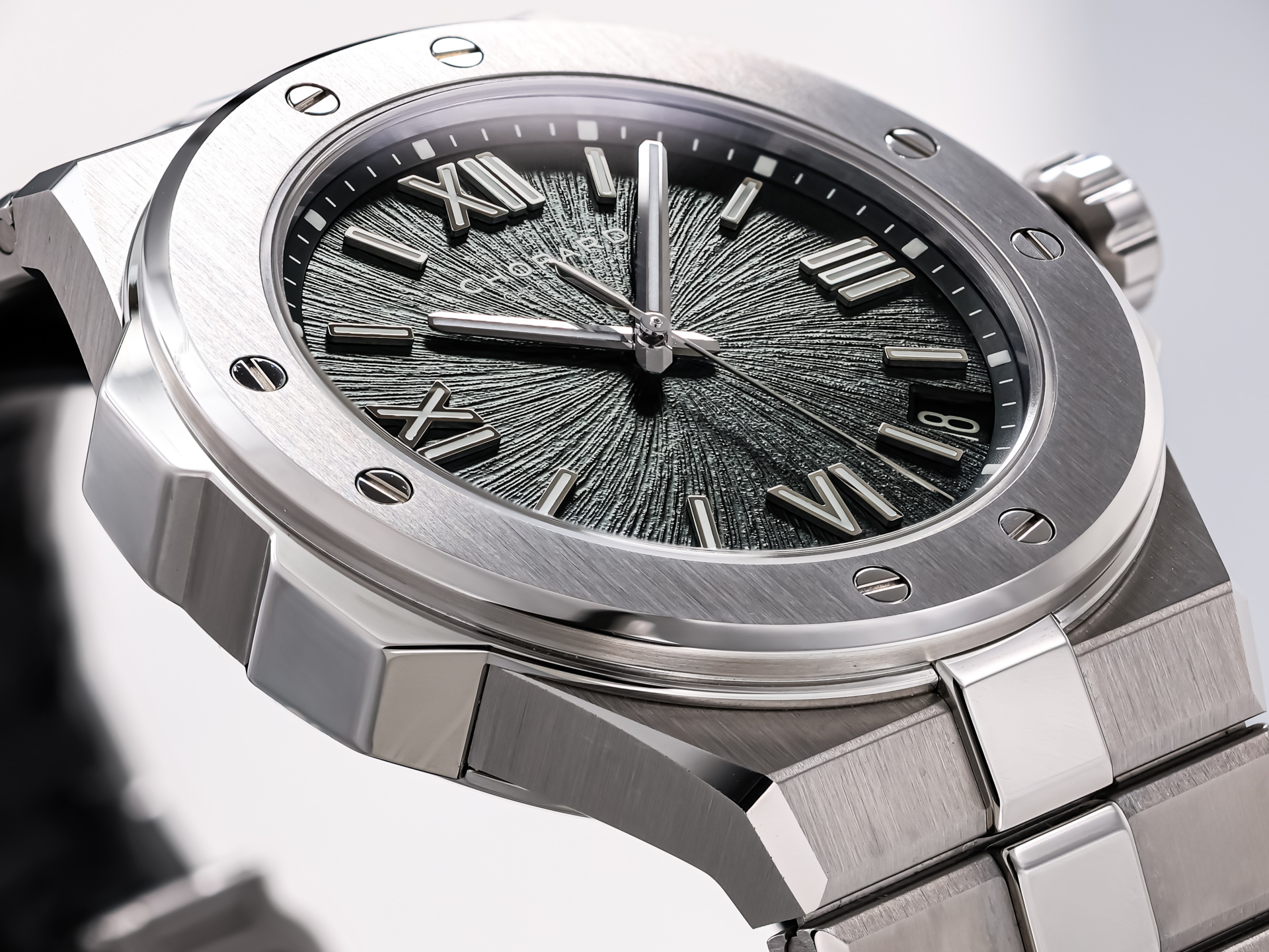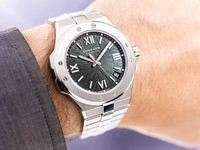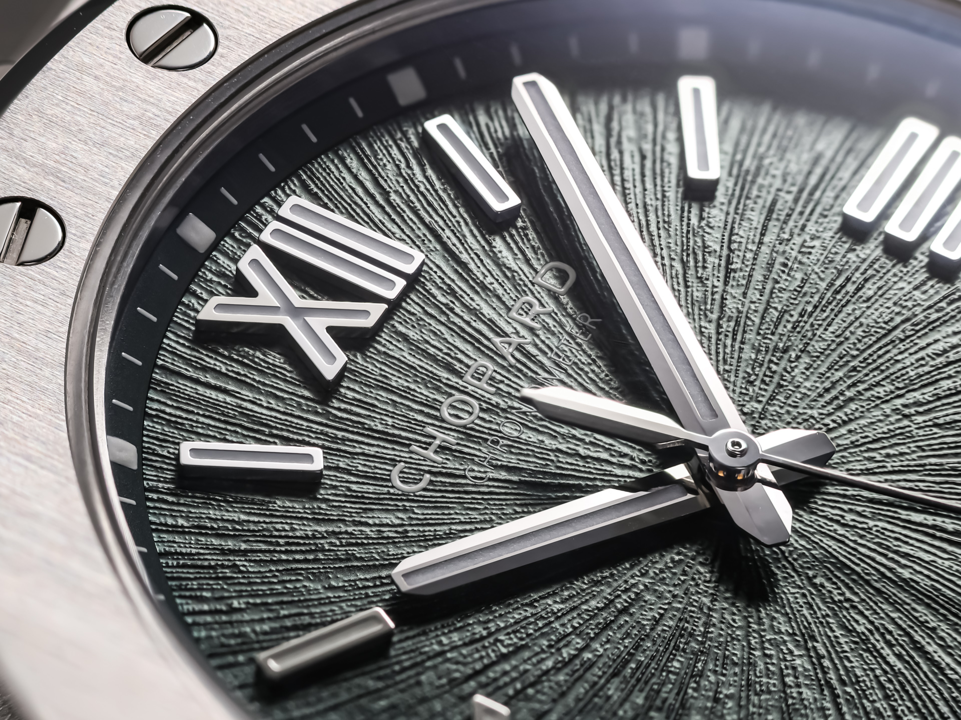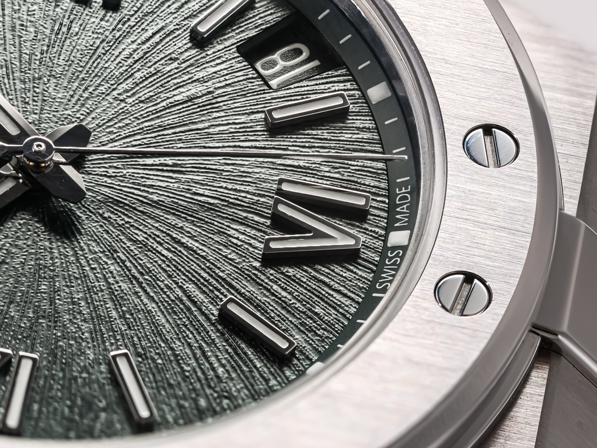 The textured pine green dial, reminiscent of an eagle’s iris, radiates with depth and vitality. It features rhodium-plated Roman numerals, applied indices, and luminous hands — all anchored by a discreet date aperture at 4:30.