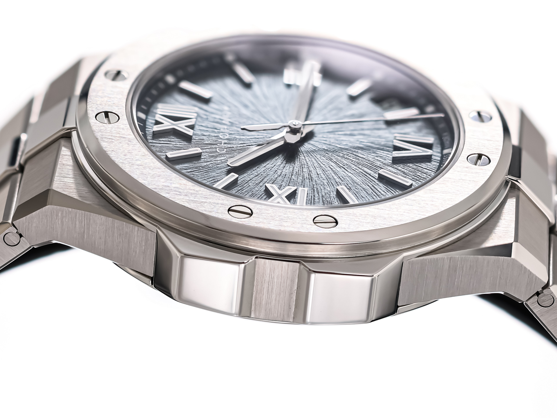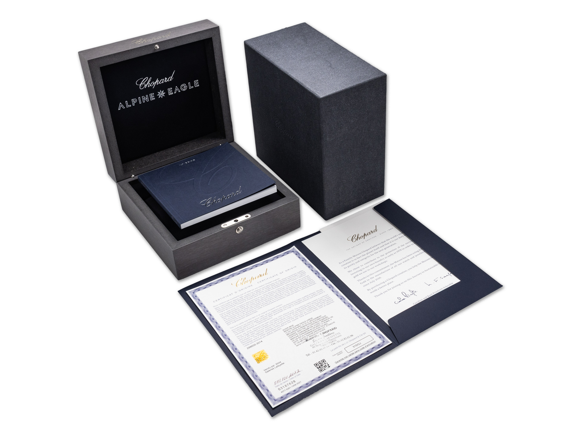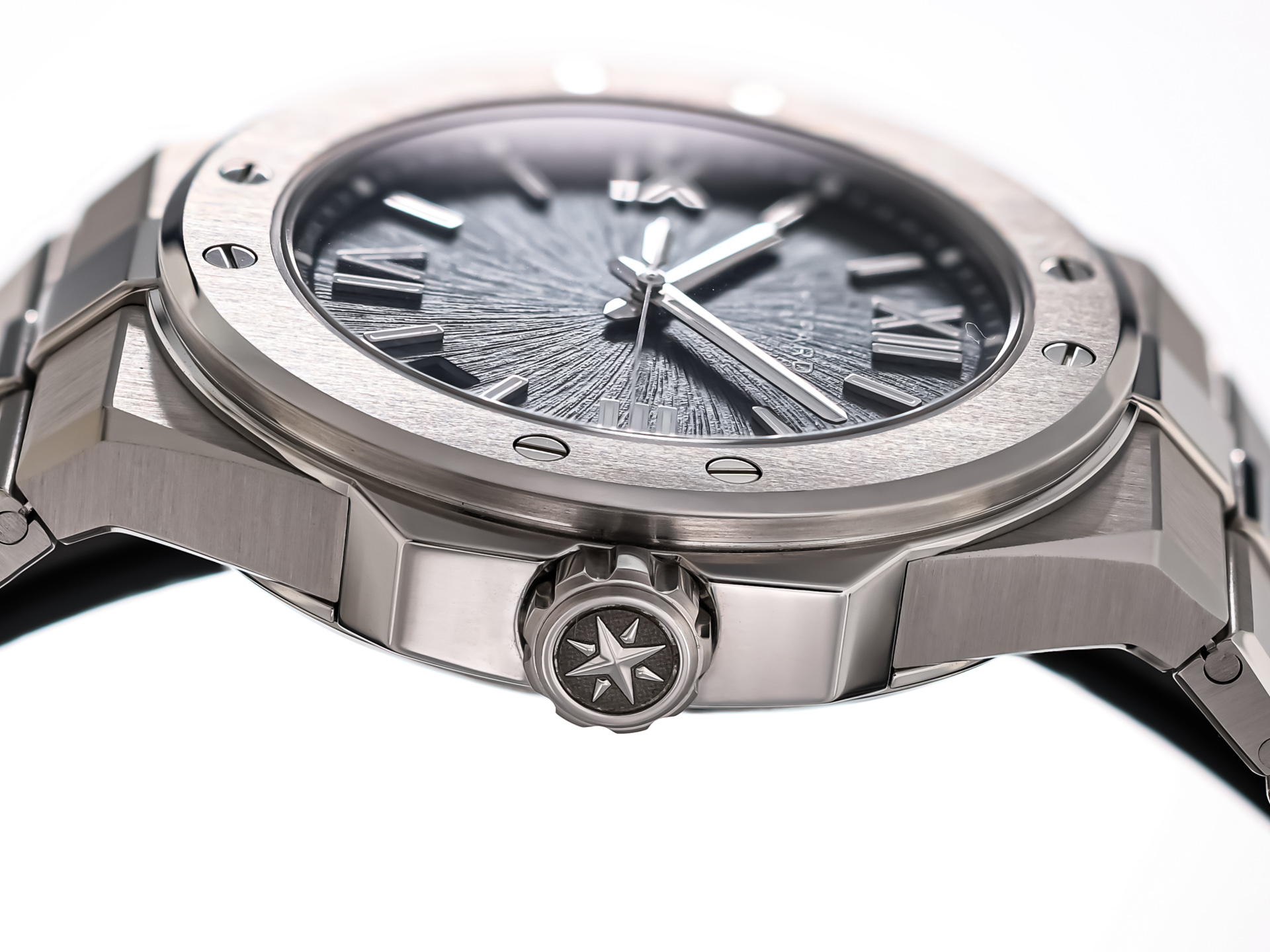 The 41mm case, sculpted from Chopard’s proprietary Lucent Steel A223, offers remarkable brilliance and durability, with a vertically brushed bezel secured by eight functional screws in a compass rose orientation — a signature Alpine Eagle design cue. The integrated bracelet flows seamlessly from the case and is finished with a sophisticated mix of satin-brushed and polished surfaces.