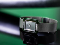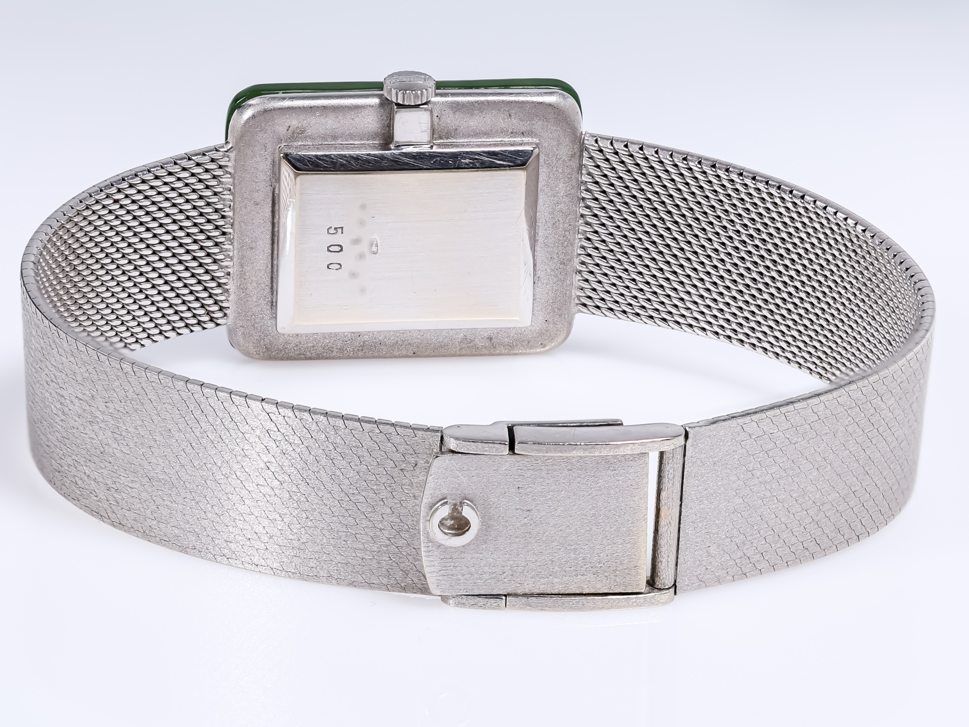 Beautiful and extraordinary ladies' jewelry watch from the early 70s. The combination of the 18-carat white gold case with green jade makes this watch a very sprcial piece. This is further emphasized by the mirror dial, which gives the watch a unique appearance.