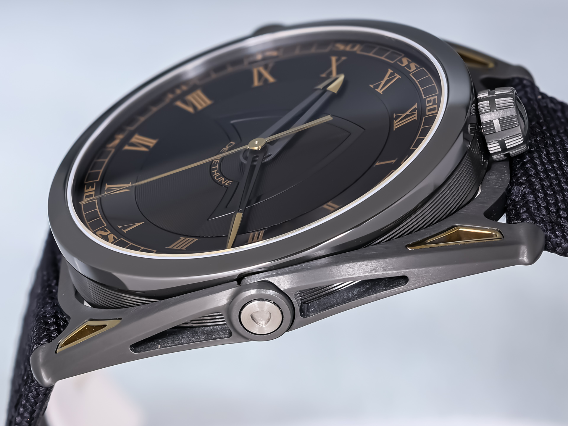 The black microlight dial is framed by contrasting gold accents that evoke the “John Player Special” aesthetic, while the off-centre date display and elegant central hands maintain perfect symmetry and visual depth.