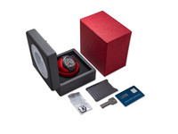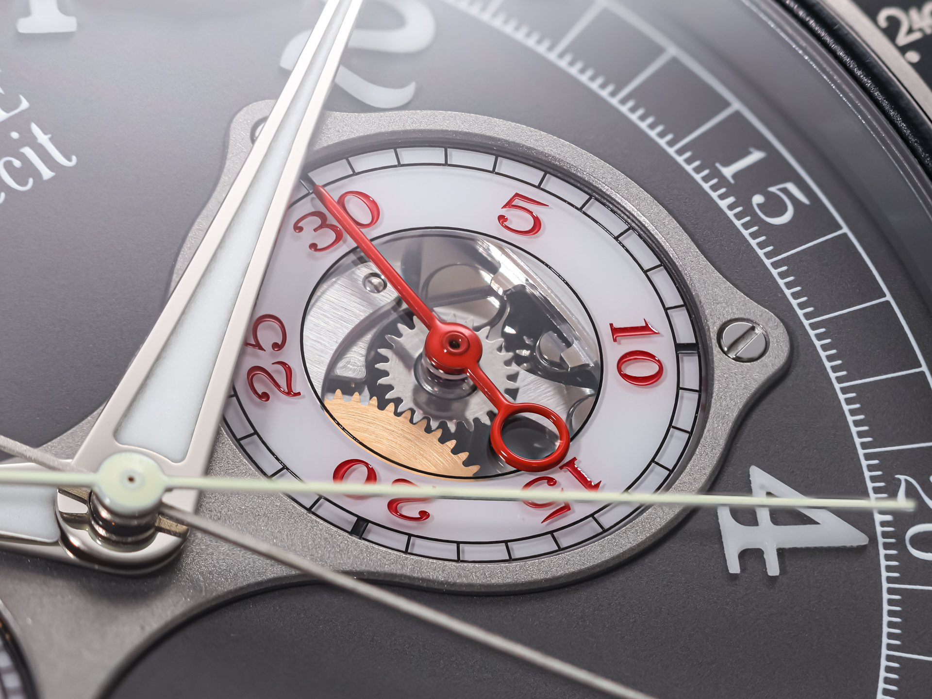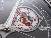 The beautifully executed grey dial with vibrant red accents emphasizes the chronograph’s technical character while ensuring outstanding legibility. The layout highlights the watch’s complex monopusher rattrapante (split-seconds) chronograph, one of the most demanding complications in watchmaking. Operated via a single pusher integrated into the crown, the chronograph allows for precise measurement of intermediate times through the split-seconds mechanism—an extraordinary feat of micro-mechanical engineering.