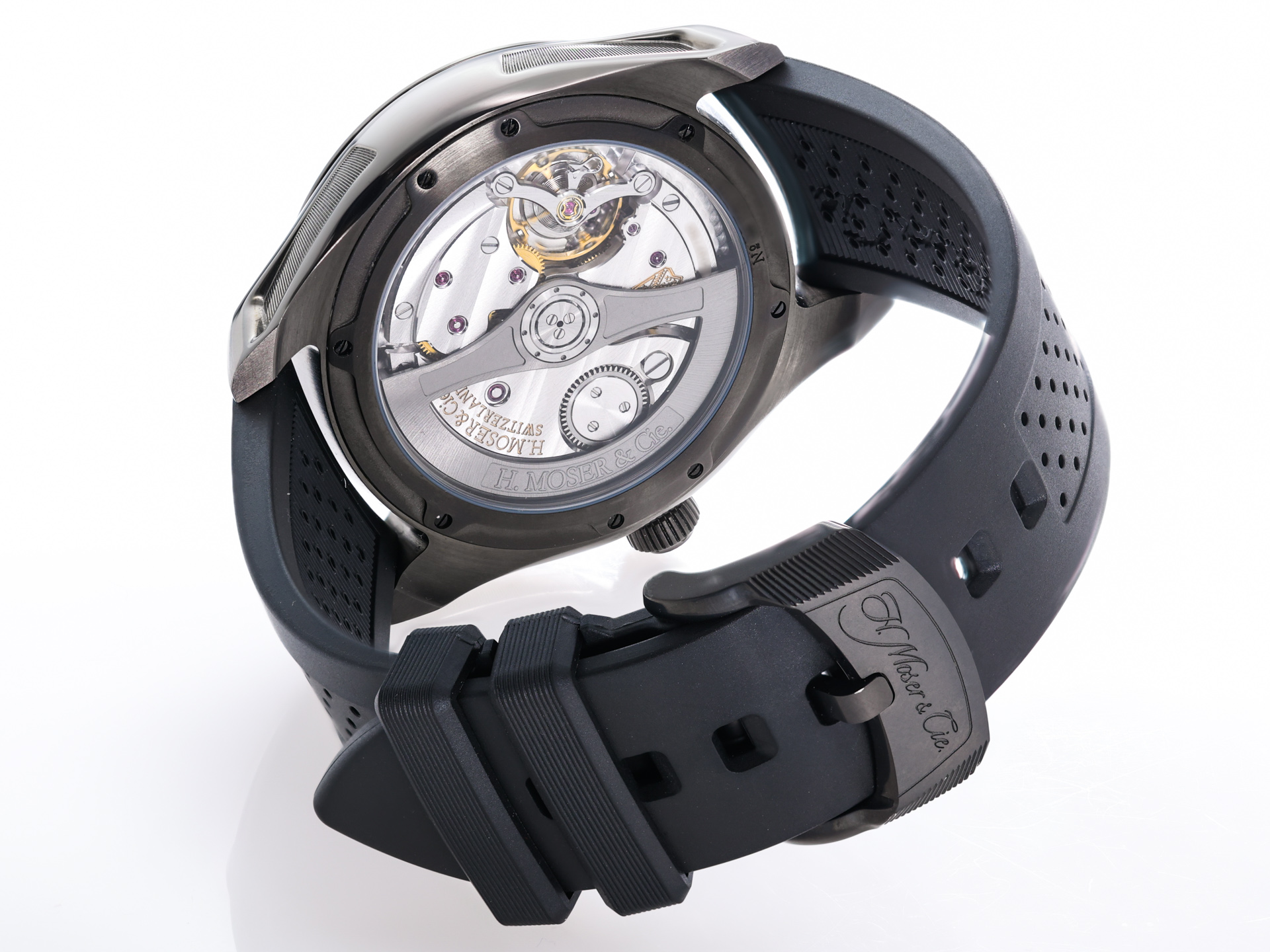 At its heart beats the HMC 200 — Moser’s in-house automatic movement, boasting a solid gold rotor, hacking seconds, and a 72-hour power reserve. The movement is visible through the sapphire caseback, displaying hand-finished Geneva stripes and polished bevels — hallmarks of the brand’s independent haute horlogerie identity.