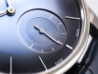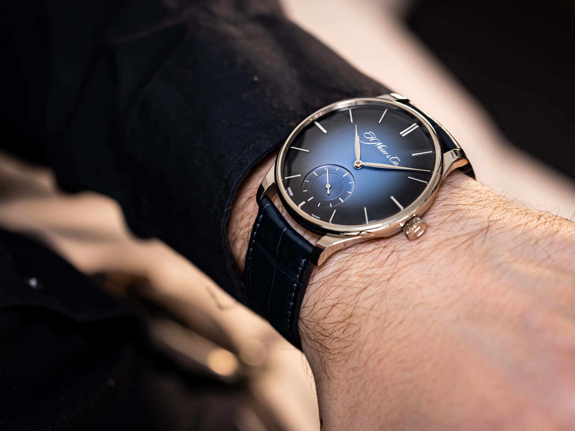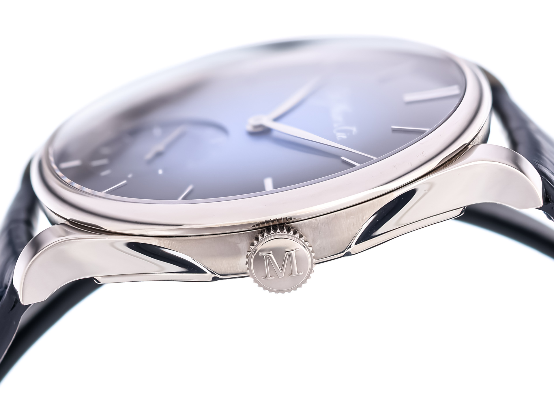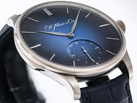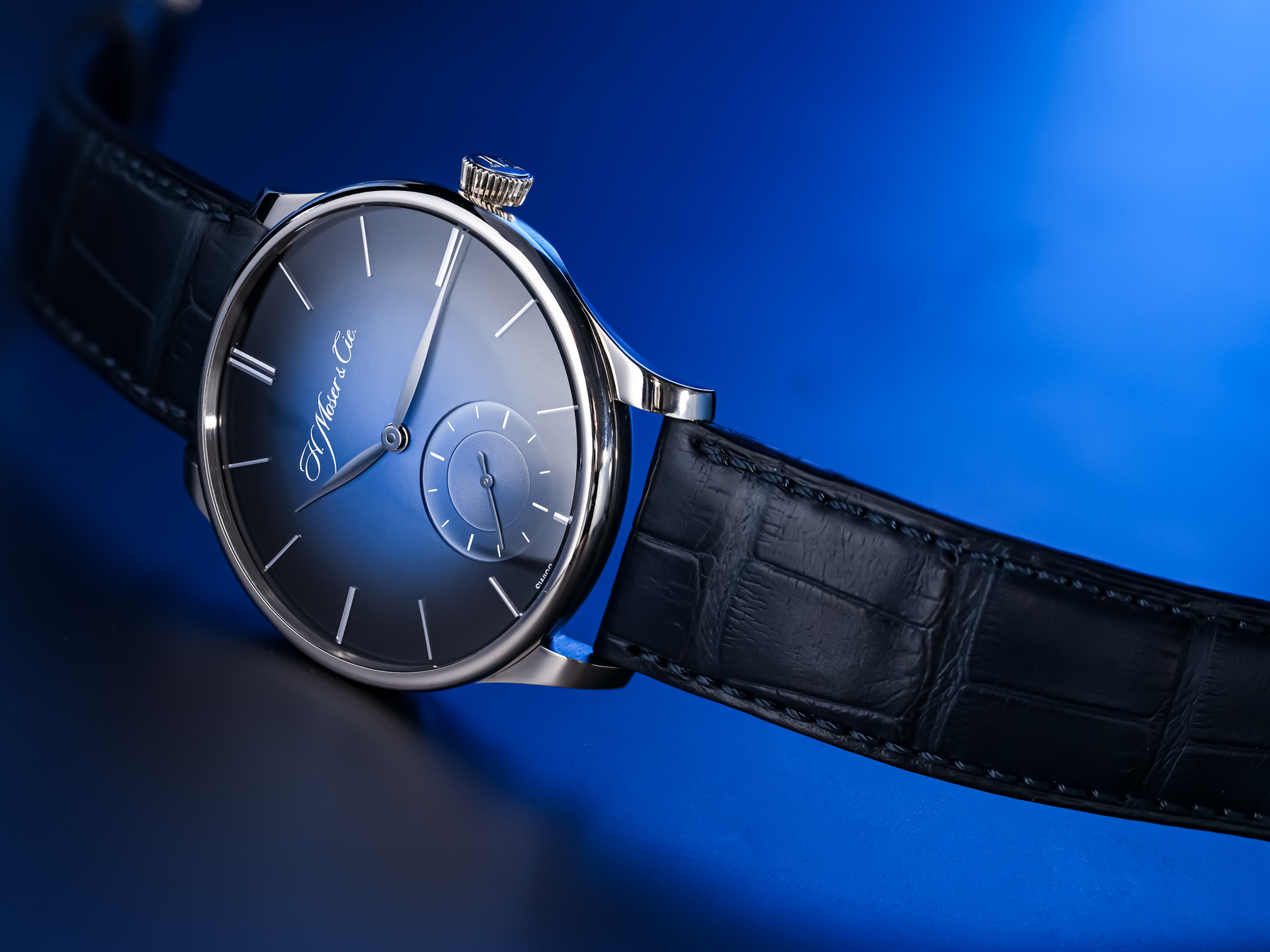 The Venturer’s beautifully proportioned case embodies classic elegance, perfectly framing the signature blue fumé dial—a hallmark of H. Moser & Cie. The dial transitions seamlessly from a vibrant sunburst blue at the center to a deep, darker hue toward the edges, creating remarkable depth and visual intrigue. Free from excessive text or logos, the minimalist dial design emphasizes purity and balance, with a discreet small seconds subdial at 6 o’clock adding a touch of classical refinement.