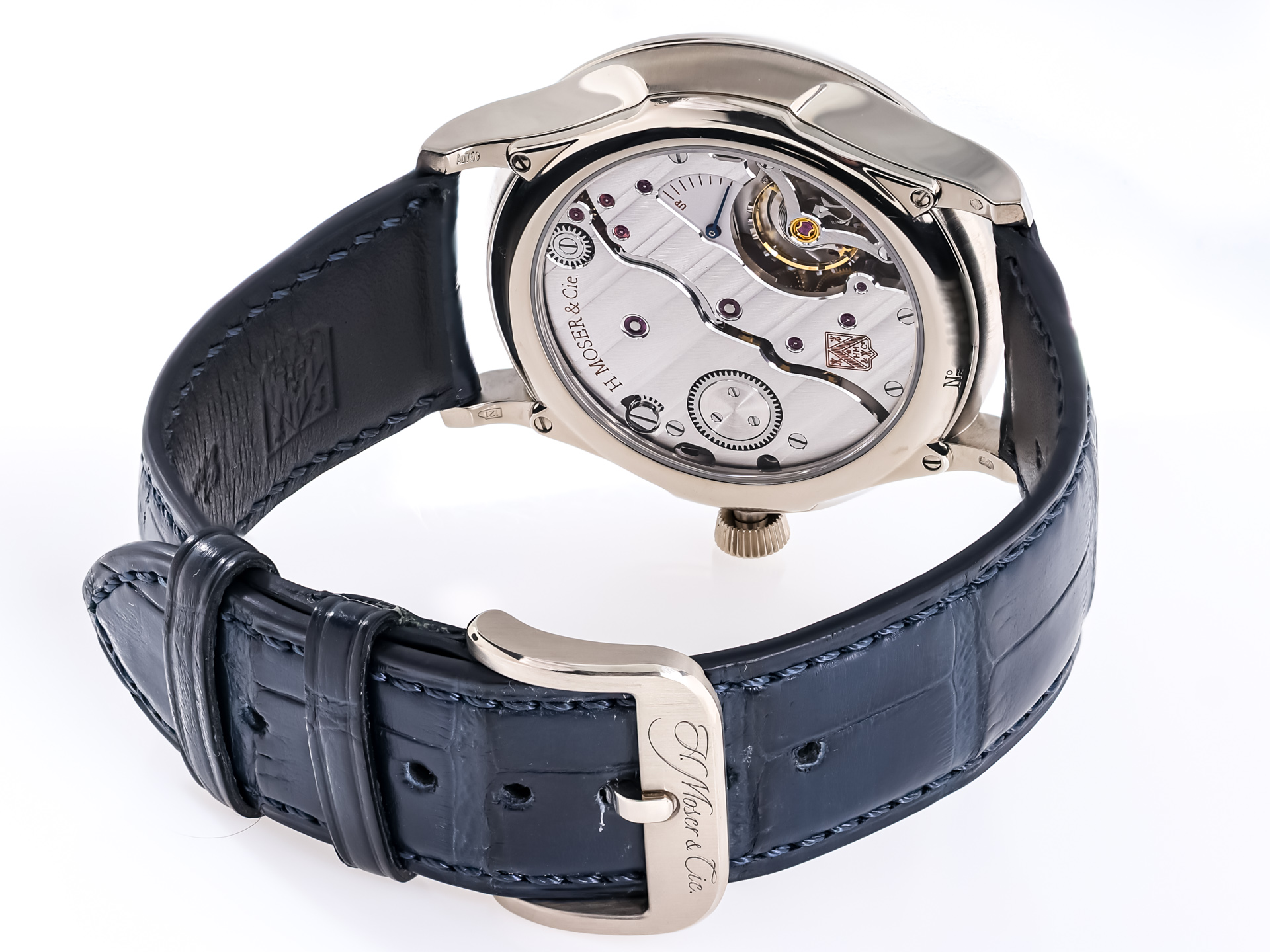 Powering this watch is the exceptional in-house Caliber HMC 327, a hand-wound movement finished to the highest standards of traditional Swiss watchmaking. It features a double barrel system, delivering an impressive power reserve of approximately 72 hours, along with superb chronometric stability. Visible through the sapphire case back, the movement showcases elegant finishing, including Moser’s signature stripes and beautifully executed components. Paired with a fine leather strap with 18k white gold pin buckle, the Venturer Small Seconds wears effortlessly, making it an ideal dress watch that balances modern sophistication with timeless design.