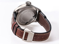 The watch is fitted with a brown calfskin leather strap with contrast stitching and secured by a titanium tang buckle. It is accompanied by a complete full set, including: