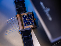 The Reverso Tribute Duoface is equipped with Jaeger-LeCoultre’s interchangeable strap system, offering instant versatility. It comes with a blue calfskin strap, and a matching two-tone strap, allowing the wearer to shift effortlessly between refined and contemporary styles.