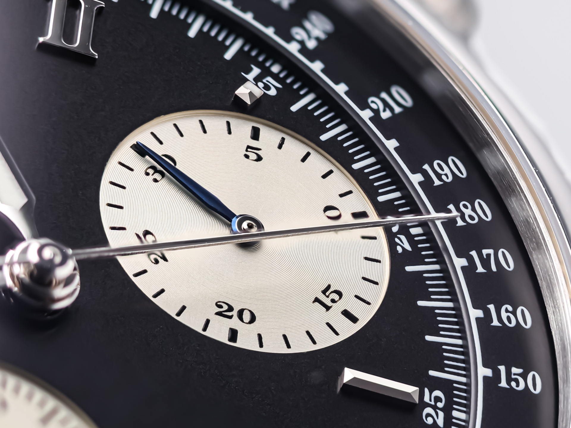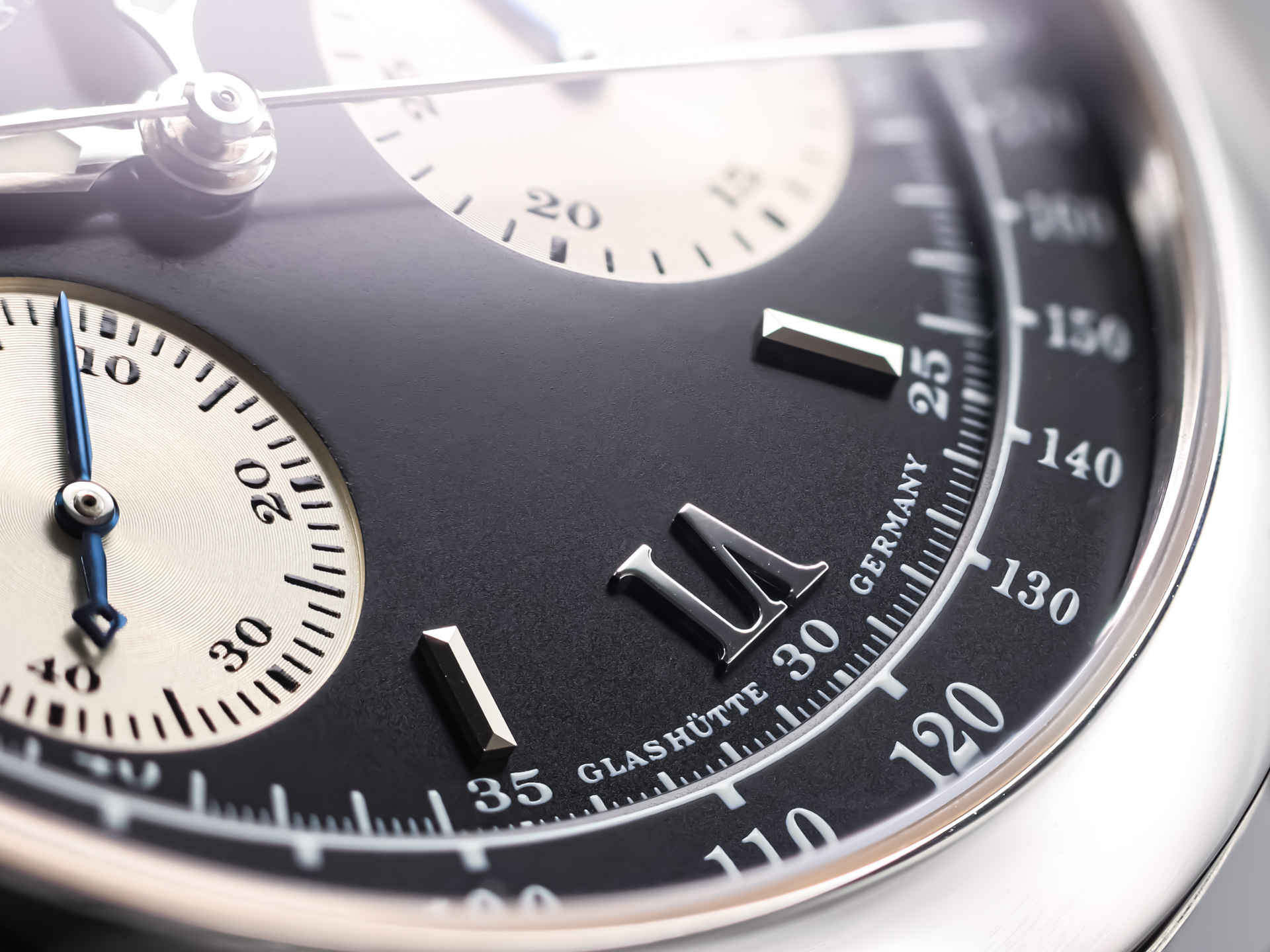 The striking black dial is beautifully executed, featuring luminous hands and markers, perfectly symmetrical chronograph counters, and Lange’s signature outsized date at 12 o’clock. The result is a dial that is both bold and refined, unmistakably German in its clarity and precision.