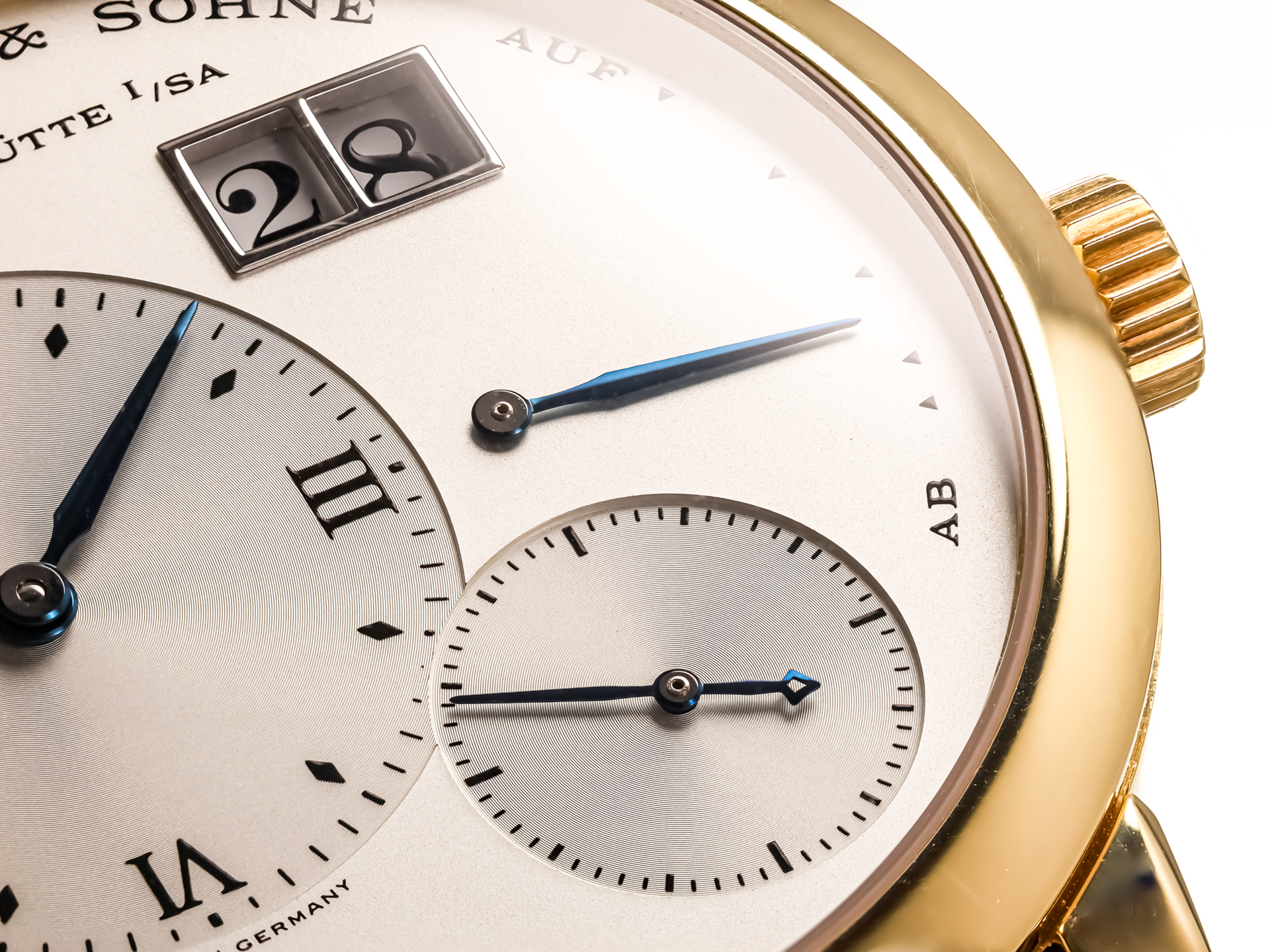 The solid silver dial features the now-iconic off-centered layout, with a large date display at 1 o’clock, a power reserve indicator between 2 and 4, and a small seconds subdial at 5 — all perfectly arranged to maintain visual harmony. The hand-blued alpha hands and applied gold markers offer a striking contrast against the satin-finished silver dial, enhancing legibility and refinement.