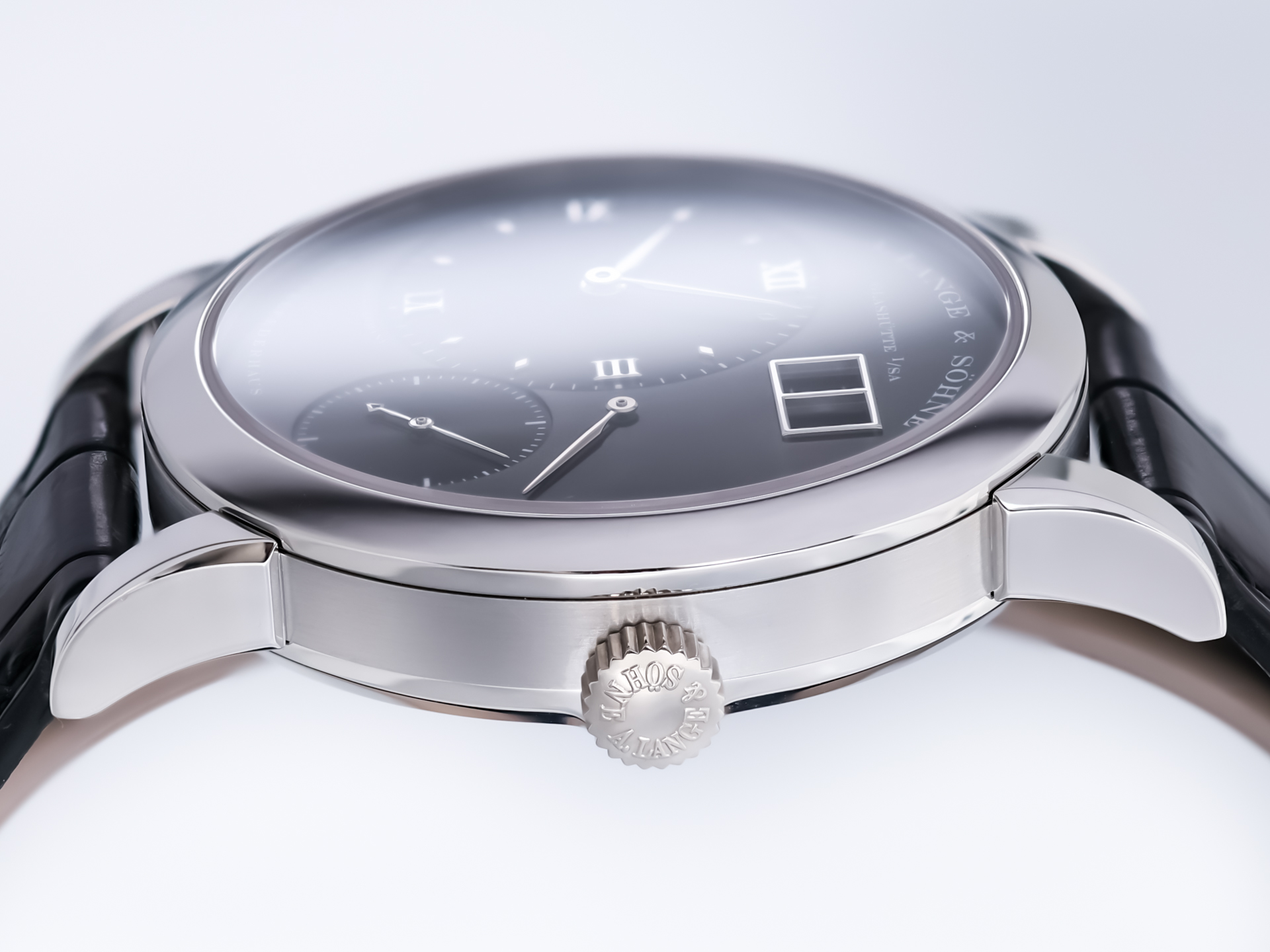 At its heart beats the manual-winding in-house caliber L901.0, visible through the sapphire crystal case back. The movement is a true work of art, featuring the traditional three-quarter plate, Glashütte ribbing, blued screws, and a hand-engraved balance cock—hallmarks of A. Lange & Söhne’s exceptional finishing standards.