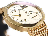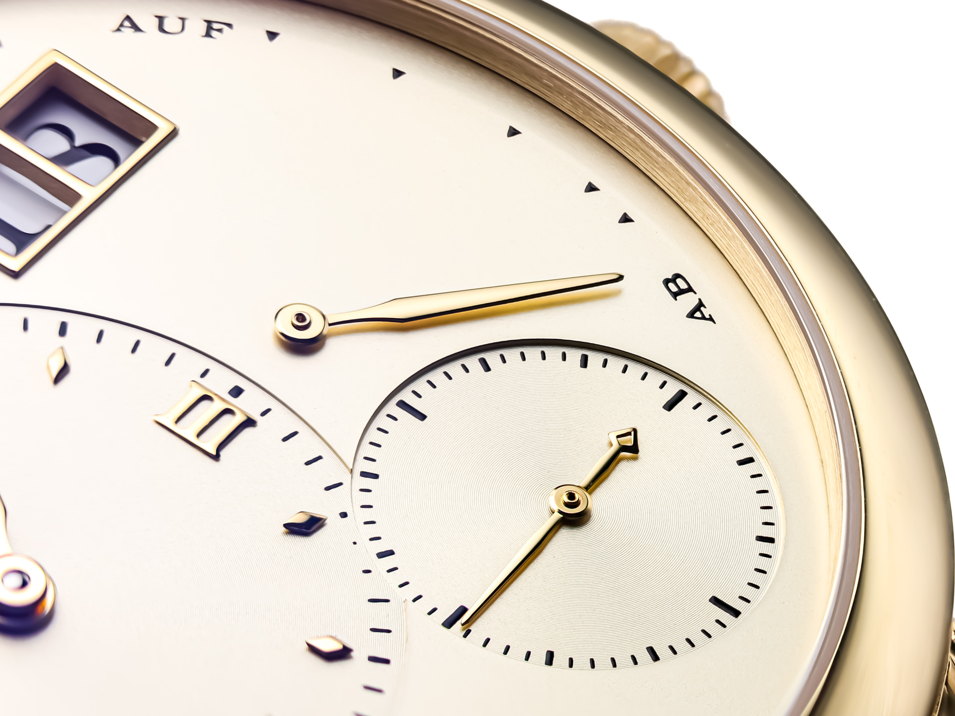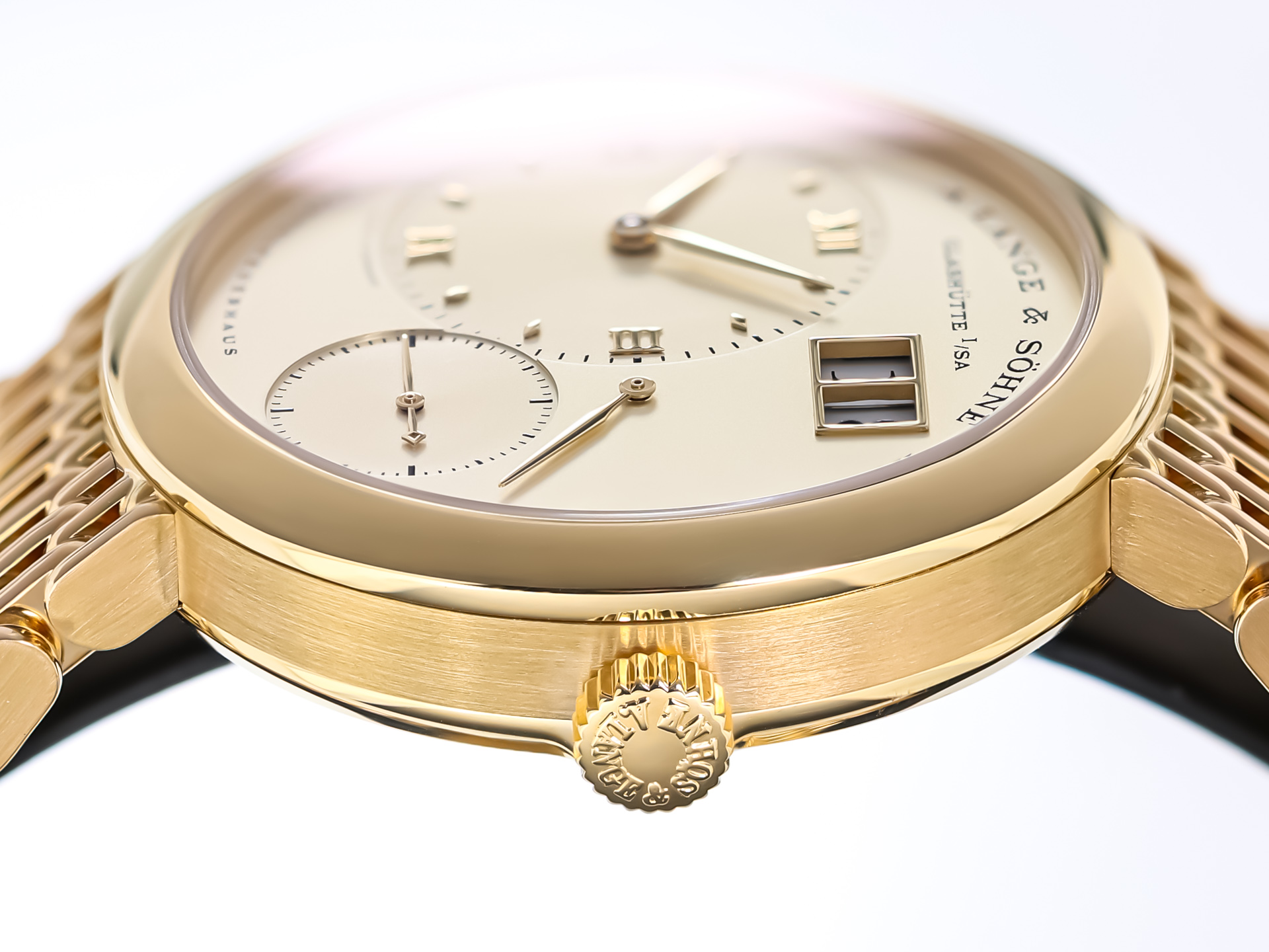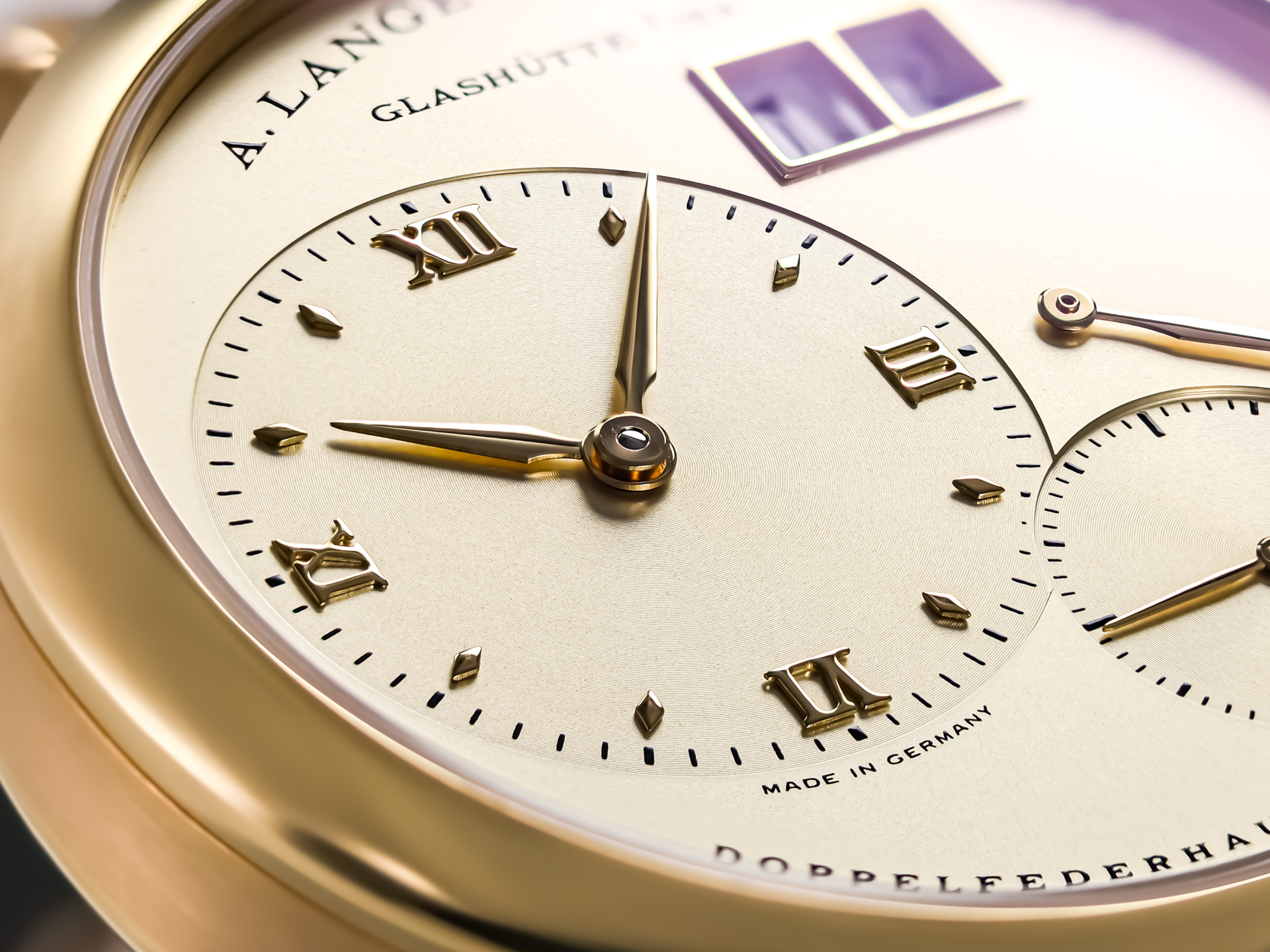The warm champagne dial is the perfect complement to the 18k yellow gold case, showcasing applied markers, thermally blued screws, and the immaculate finishing that defines Lange’s craftsmanship. Each indication is placed with architectural intent, achieving a balance that feels both mathematical and poetic.