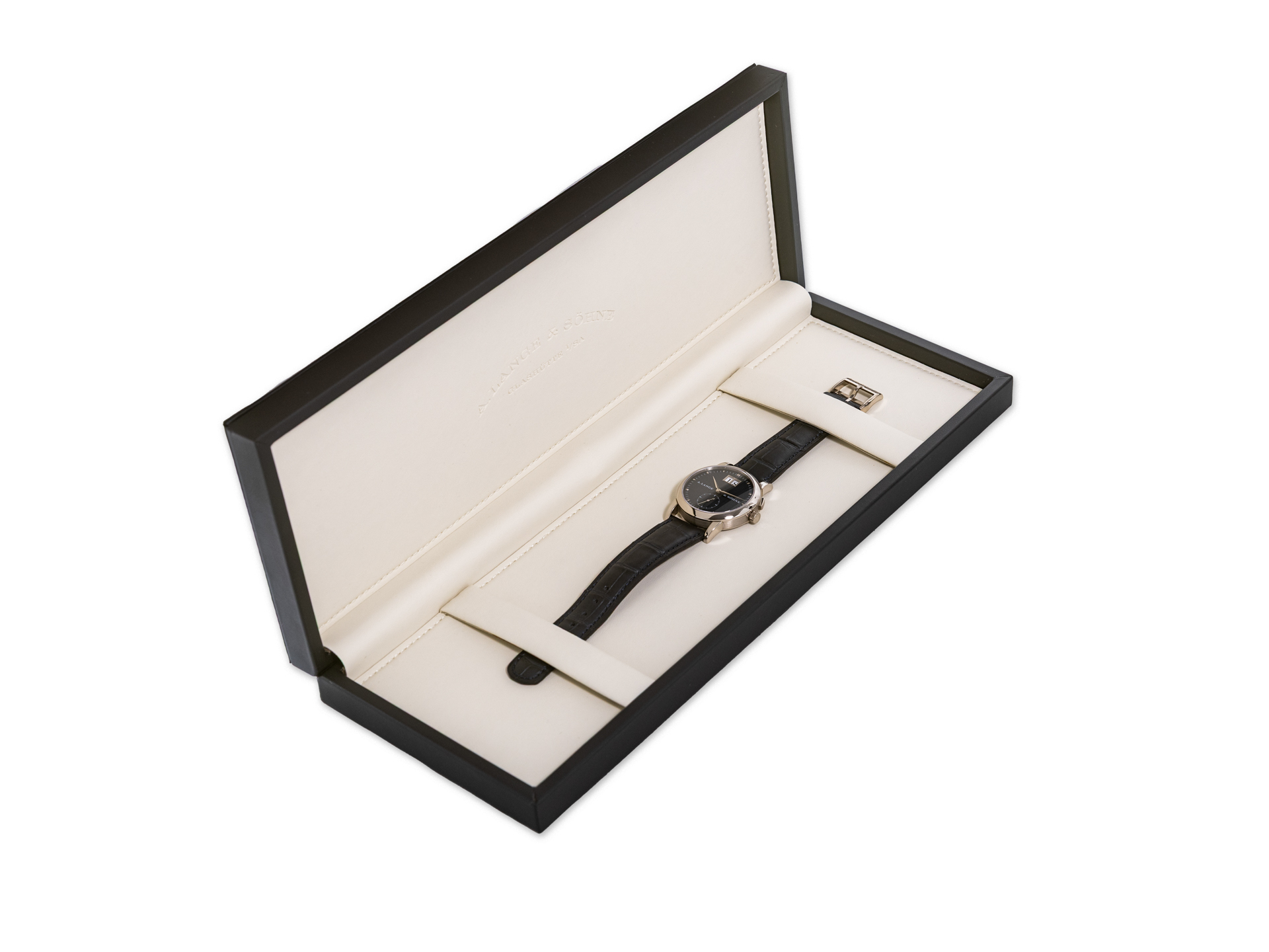 Manufactured in 18k white gold and dating to 1998, this refined watch is offered in excellent condition and accompanied by its original box. Further enhancing its appeal, the timepiece has undergone a recent service in 2026 through Bucherer in collaboration with A. Lange & Söhne, ensuring optimal performance and reliability. Two years warranty until march 2028!