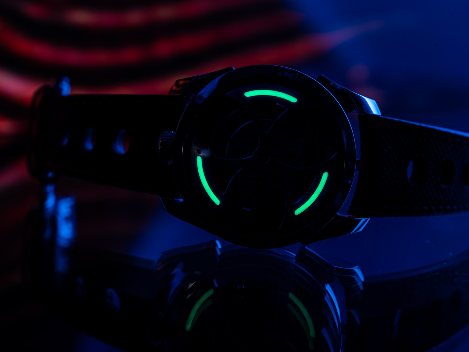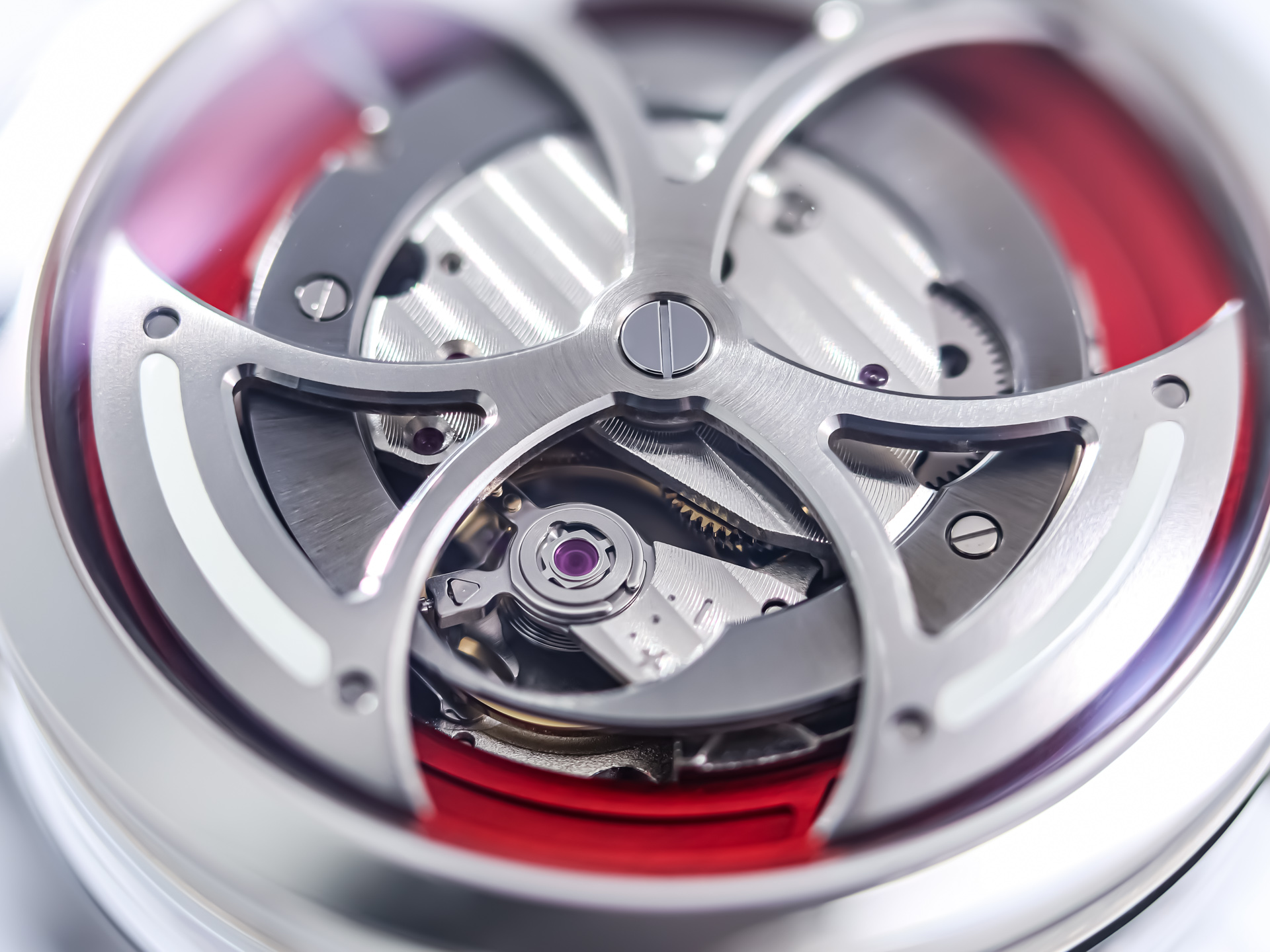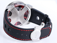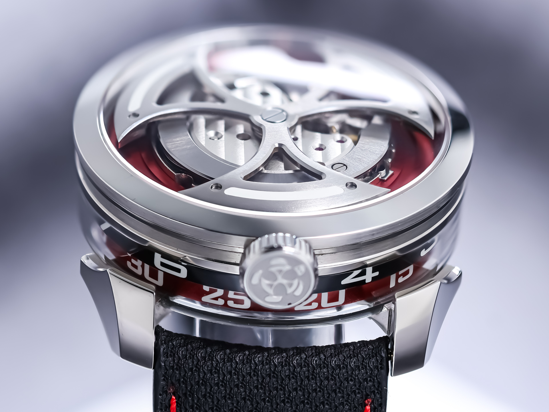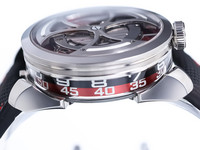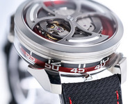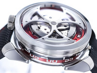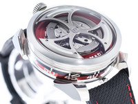 Signature MB&F creativity shines through in the M.A.D.1 Red. The vibrant red accents add intensity without overshadowing the sculptural case and futuristic structure. Time is displayed laterally through a set of rotating cylinders, allowing you to read the hours and minutes without lifting your wrist—an ergonomic and visually striking solution inspired by avant-garde horological concepts.