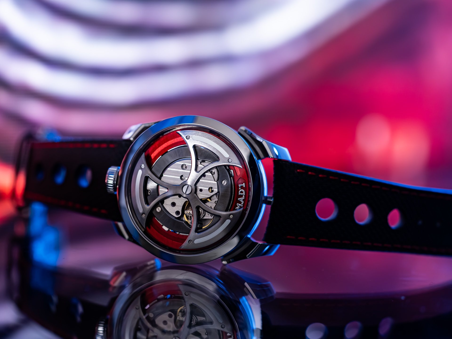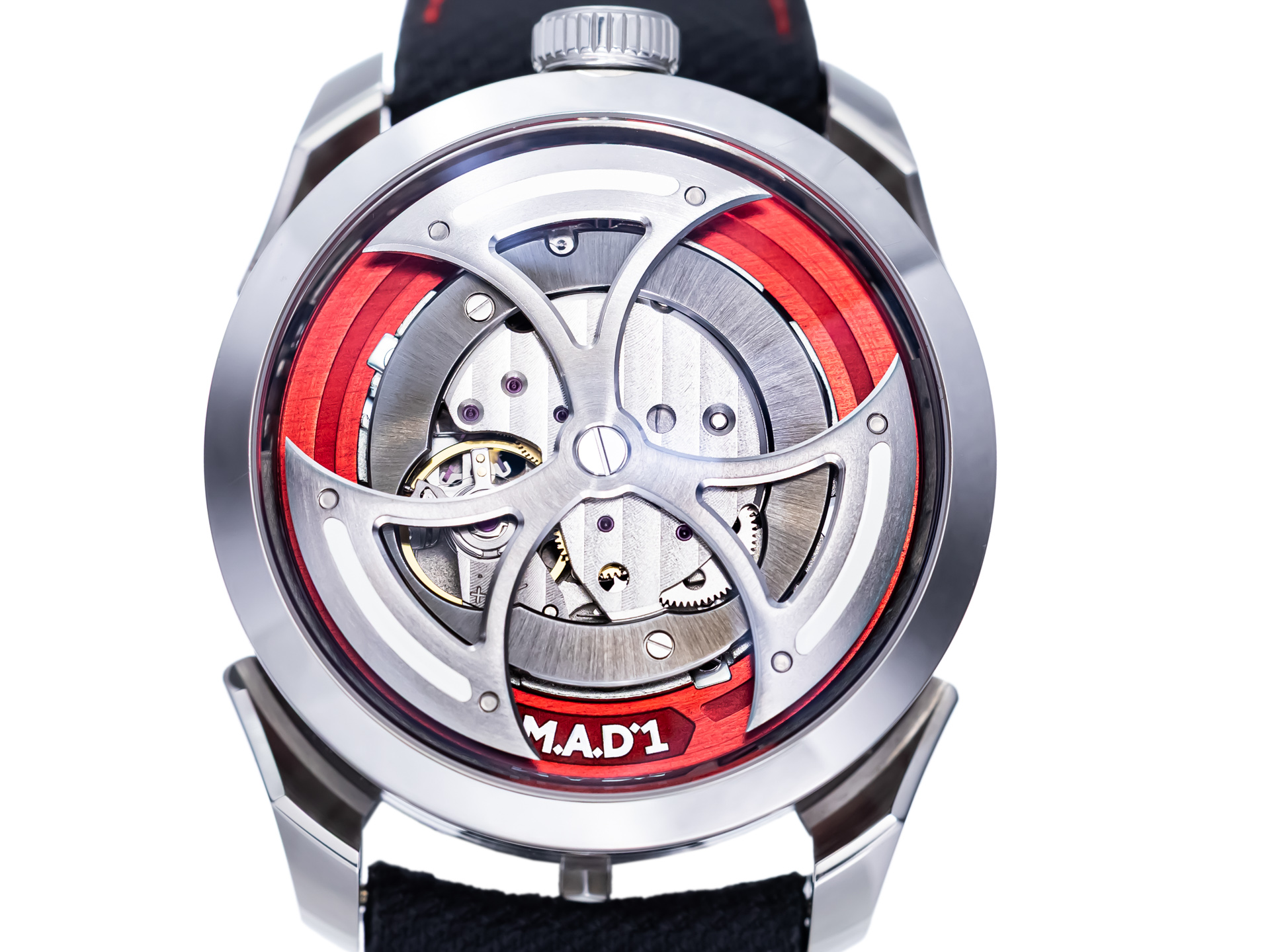 At the heart of the M.A.D.1 Red Edition is a wonderfully unconventional movement turned inside-out. Instead of hiding its mechanics, the watch proudly showcases its oscillating mass on the dial side. The result is an entrancing triple-bladed rotor that spins with incredible energy, giving the watch a dynamic, kinetic personality. This inverted Miyota 821A-based movement has been meticulously reworked to maximize visual impact—every turn of the rotor feels like mechanical fireworks on your wrist.