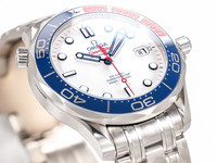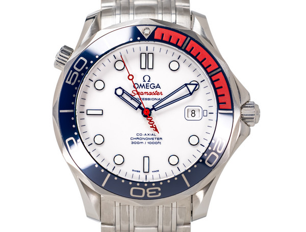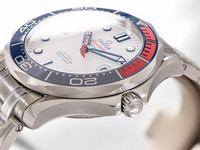 Released in 2017 in a limited run of 7,007 pieces, the Commander’s Watch pays homage to Bond’s naval rank and the red, white, and blue colors of the Royal Navy. The stainless steel case, measuring 41mm, features Omega’s signature twisted lugs, a polished ceramic bezel insert in blue with a contrasting red rubber 15-minute scale, and a helium escape valve at 10 o’clock — all classic cues of the Seamaster 300M line.