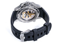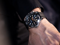 The spiral-brushed black ceramic dial is laser-engraved with James Bond’s iconic gun-barrel design, featuring a precisely measured 9 mm center, a direct reference to the caliber of Bond’s signature firearm. Subtle details throughout the dial echo the legacy of the world’s most famous secret agent.