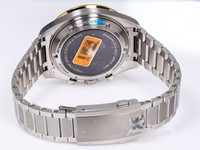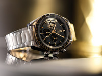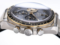 The 42mm stainless steel case is fitted with an 18k Moonshine™ gold bezel — Omega’s proprietary alloy, developed for improved resistance to fading. The black polished ceramic bezel insert features the iconic tachymeter scale in Ceragold™, creating a visually striking contrast.