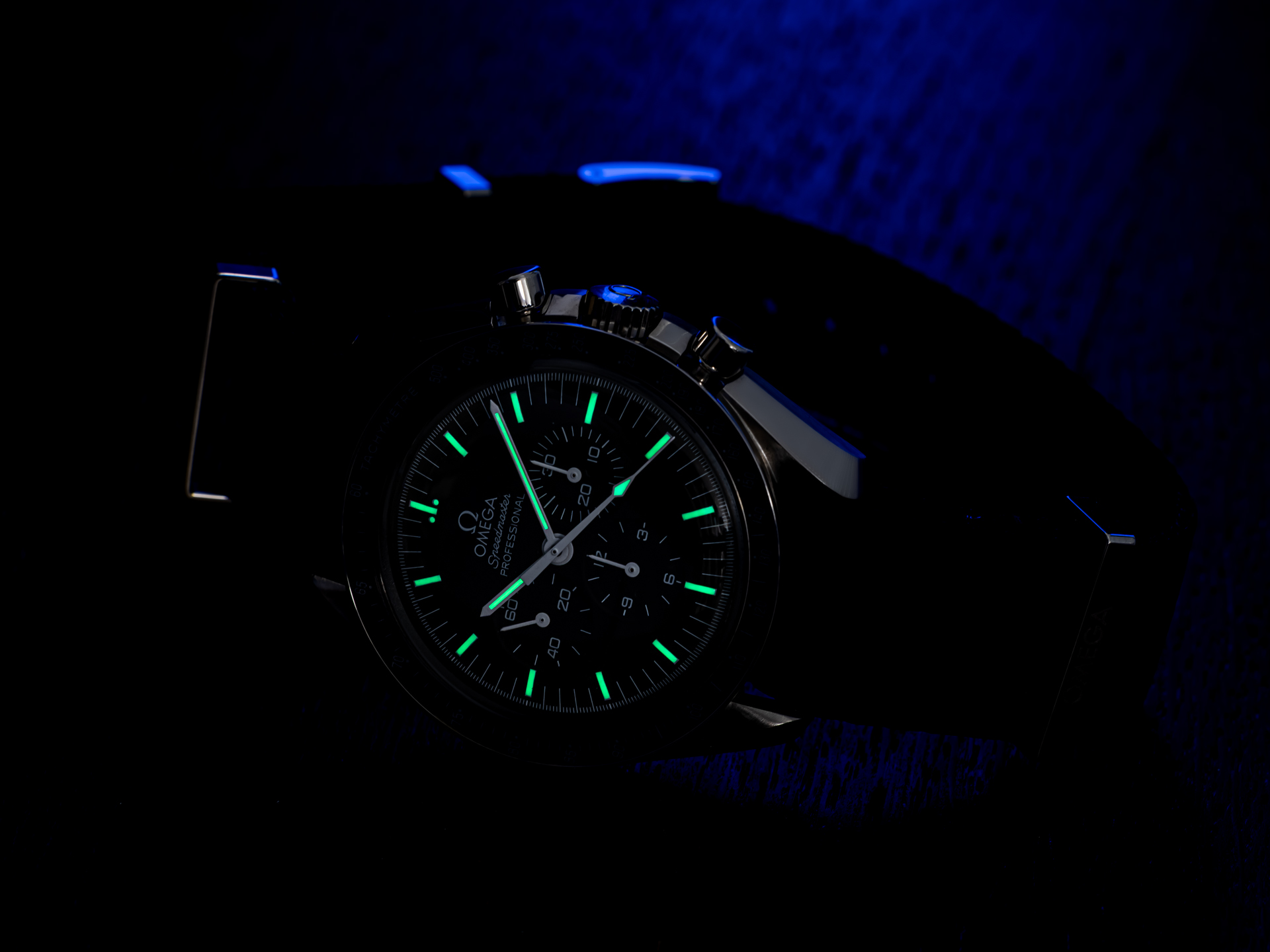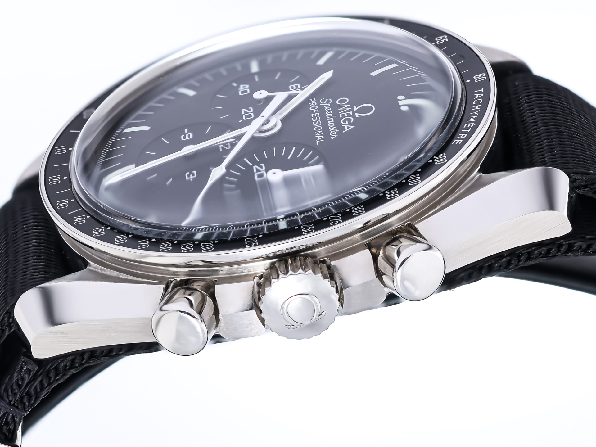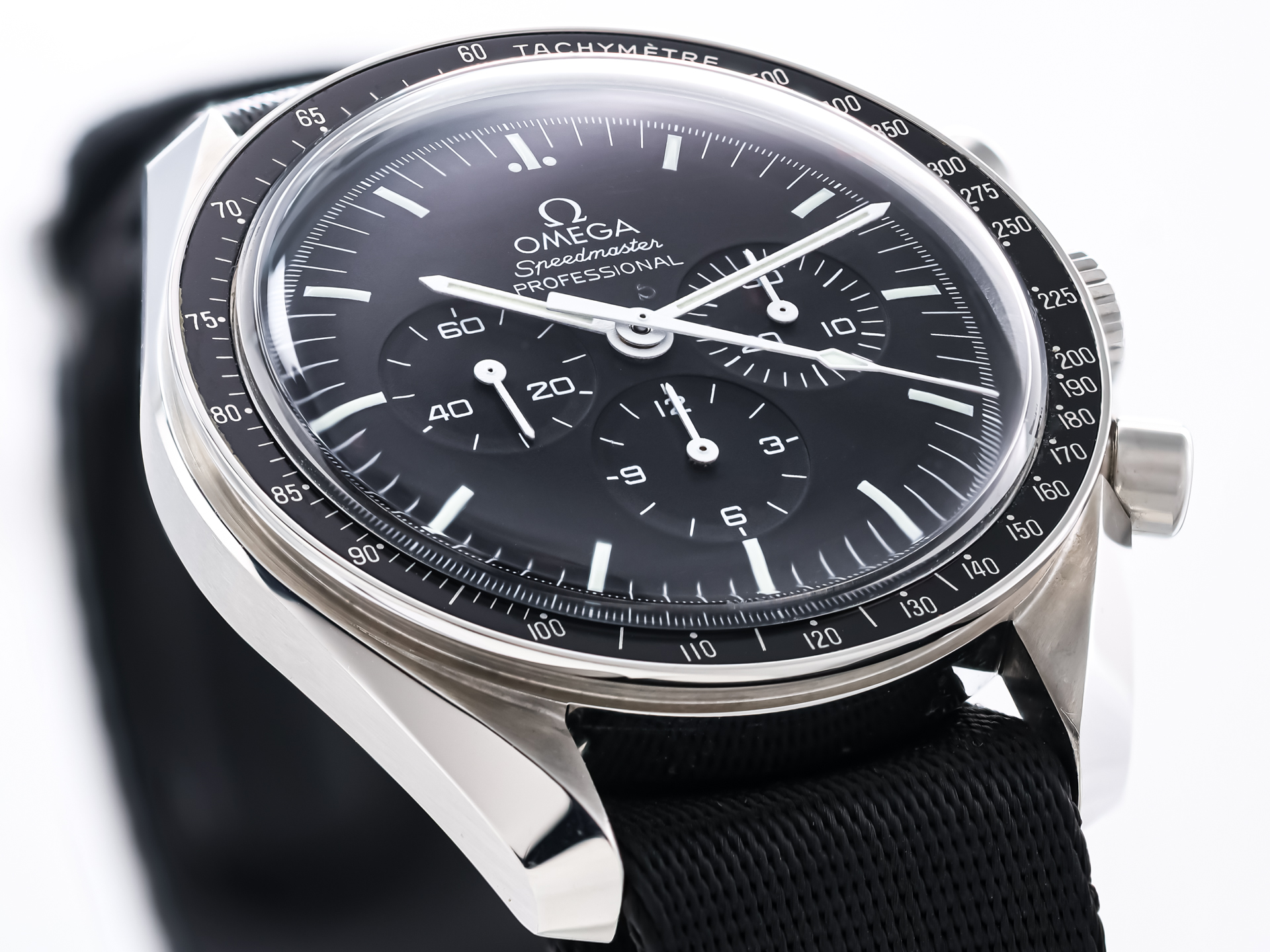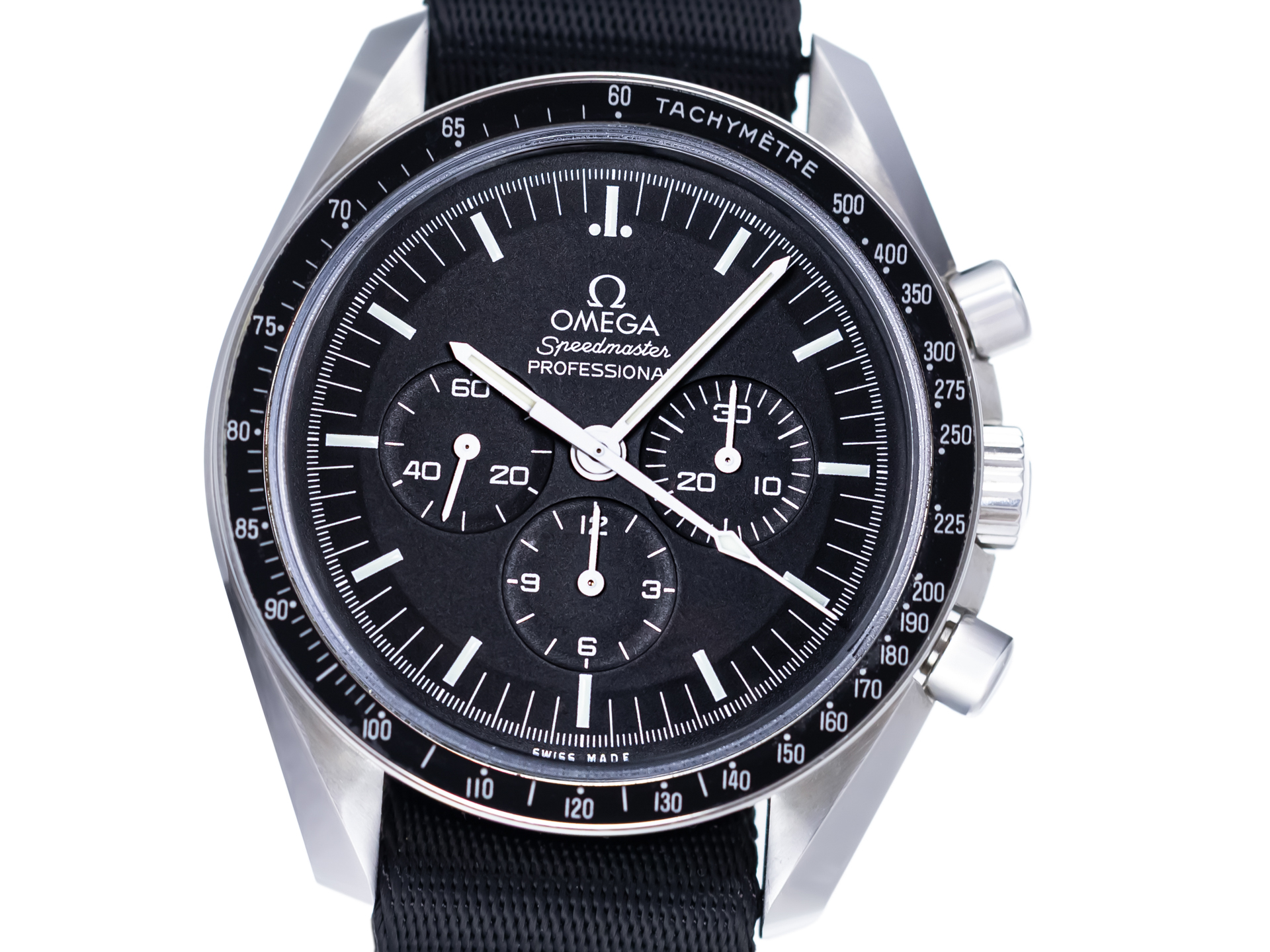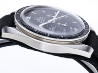 This example is fitted with an original Omega NATO strap, giving the watch a sporty and versatile character while emphasizing its tool-watch heritage. The NATO configuration enhances wearing comfort and underscores the Speedmaster’s adventurous spirit.