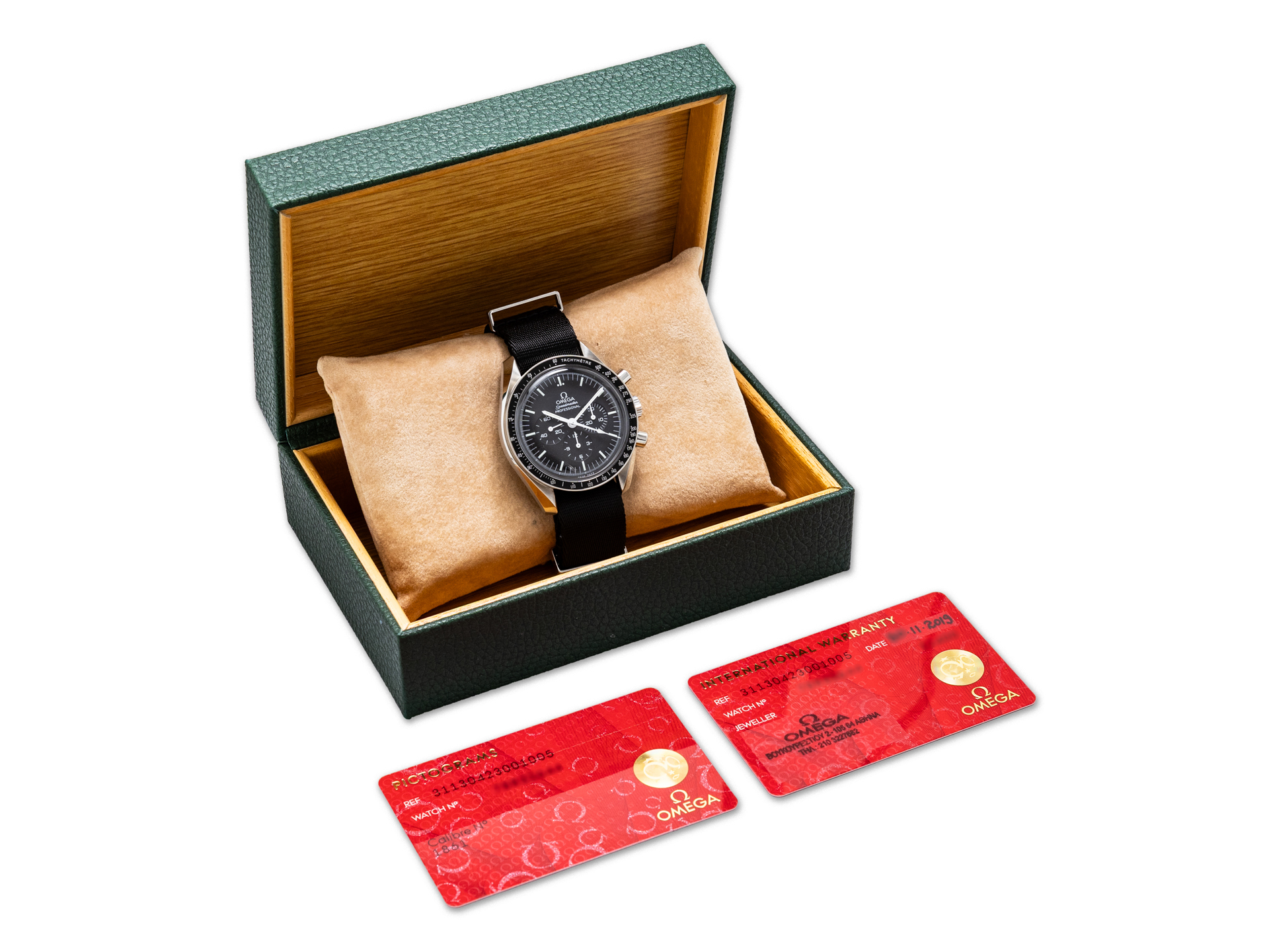 This Omega Speedmaster Professional Moonwatch Ref. 311.30.42.30.01.005 (2019, Greece) is offered with: