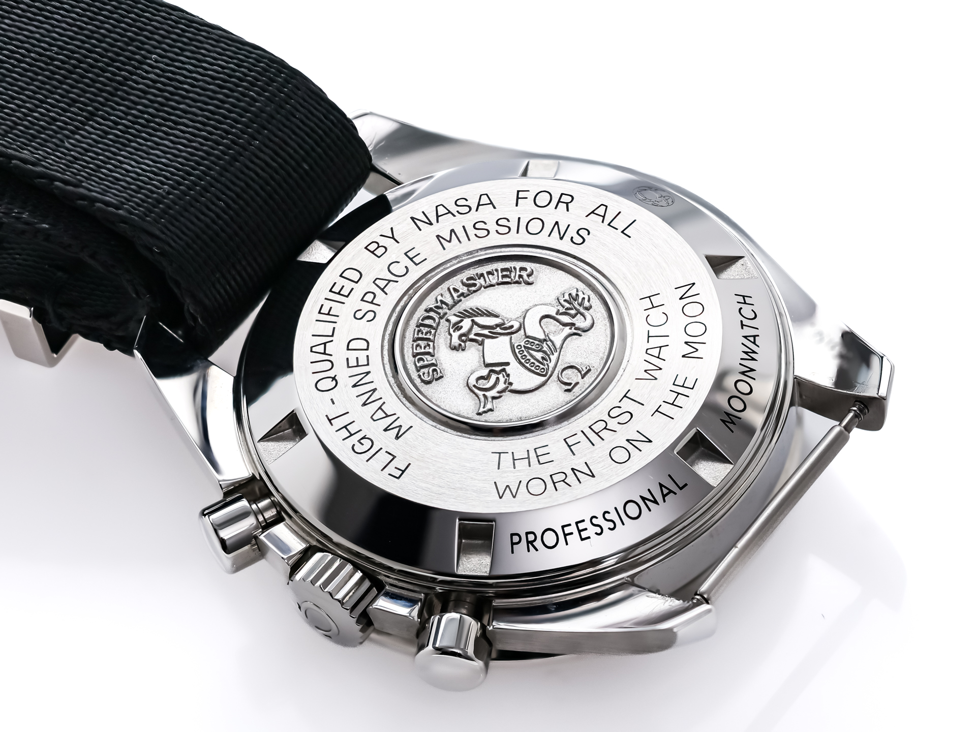 The black dial with white printed hour markers and chronograph scales ensures exceptional legibility. The classic tri-compax layout with small seconds, 30-minute counter, and 12-hour counter is both functional and perfectly balanced. Luminous hands and indices provide excellent visibility in low-light conditions, while the solid steel case back is engraved with the famous Moonwatch inscription, celebrating the Speedmaster’s role in space exploration.