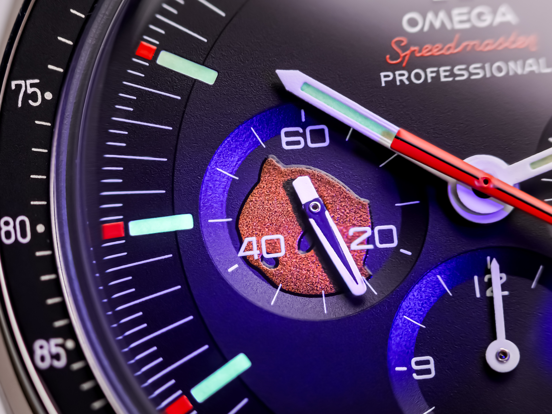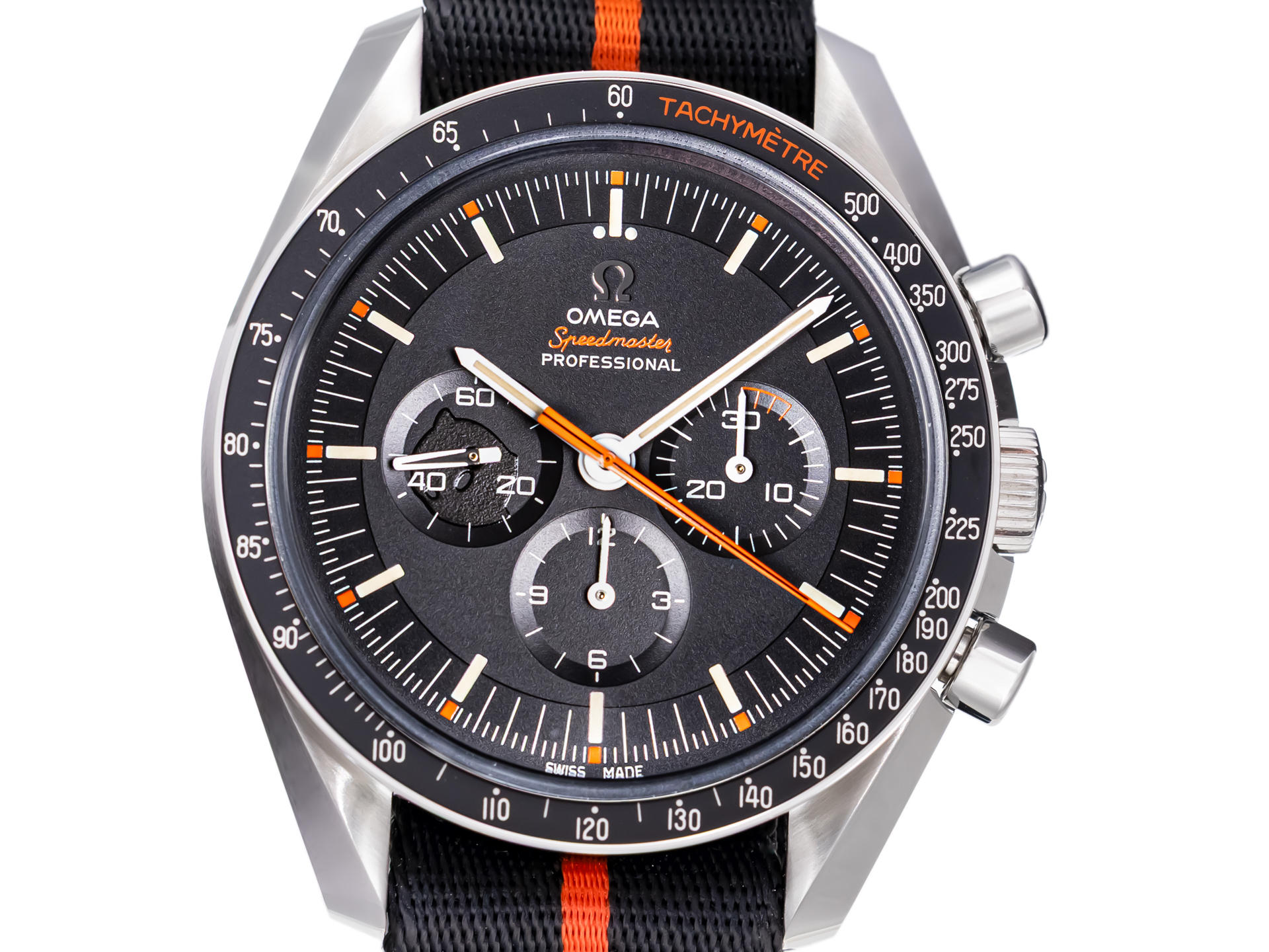 - Black dial with orange “Ultraman” chronograph seconds hand