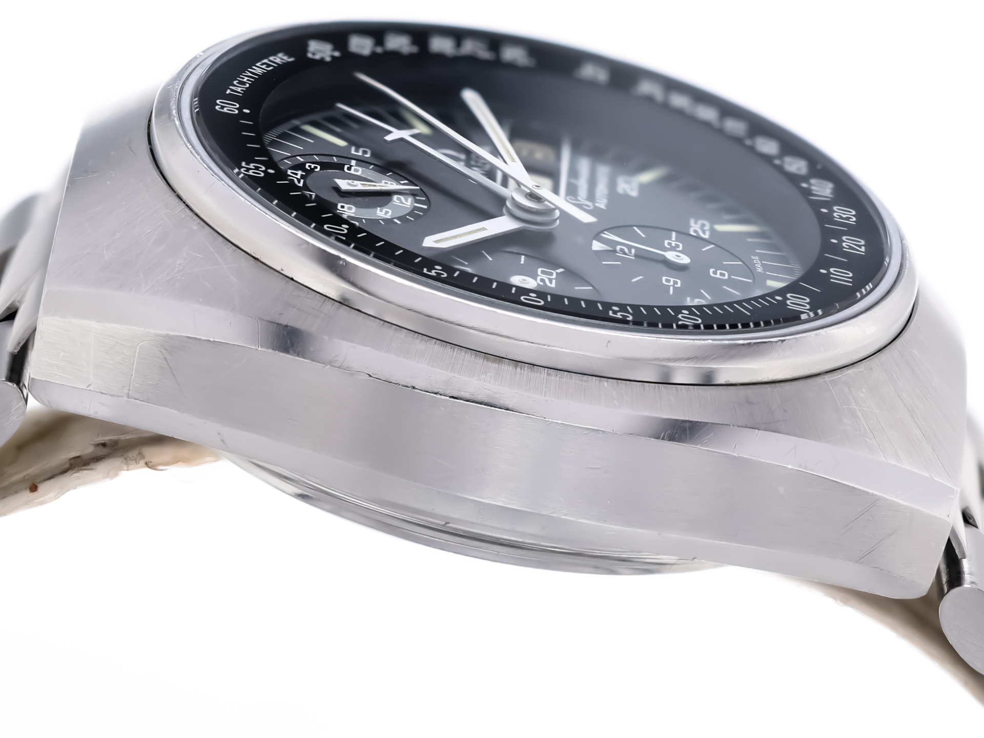 - Tachymeter scale integrated under the mineral crystal