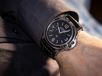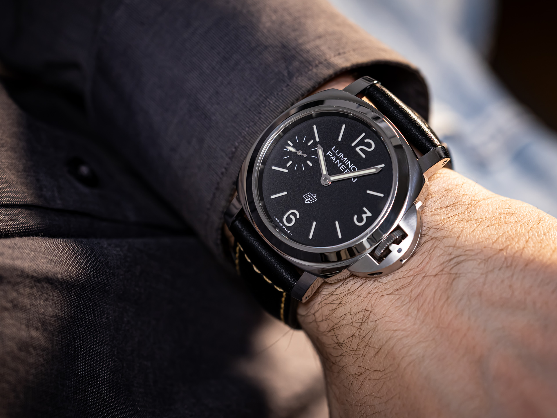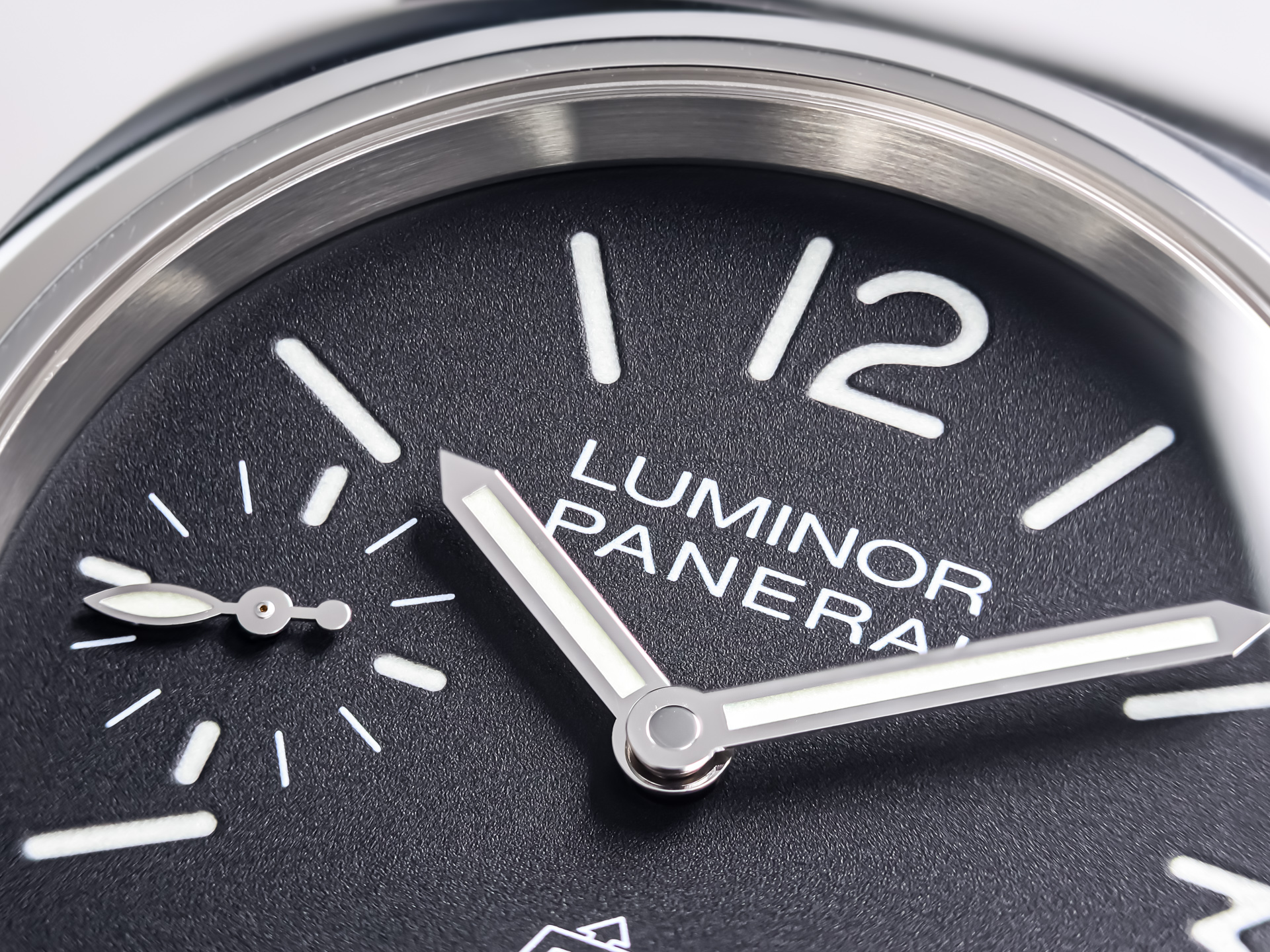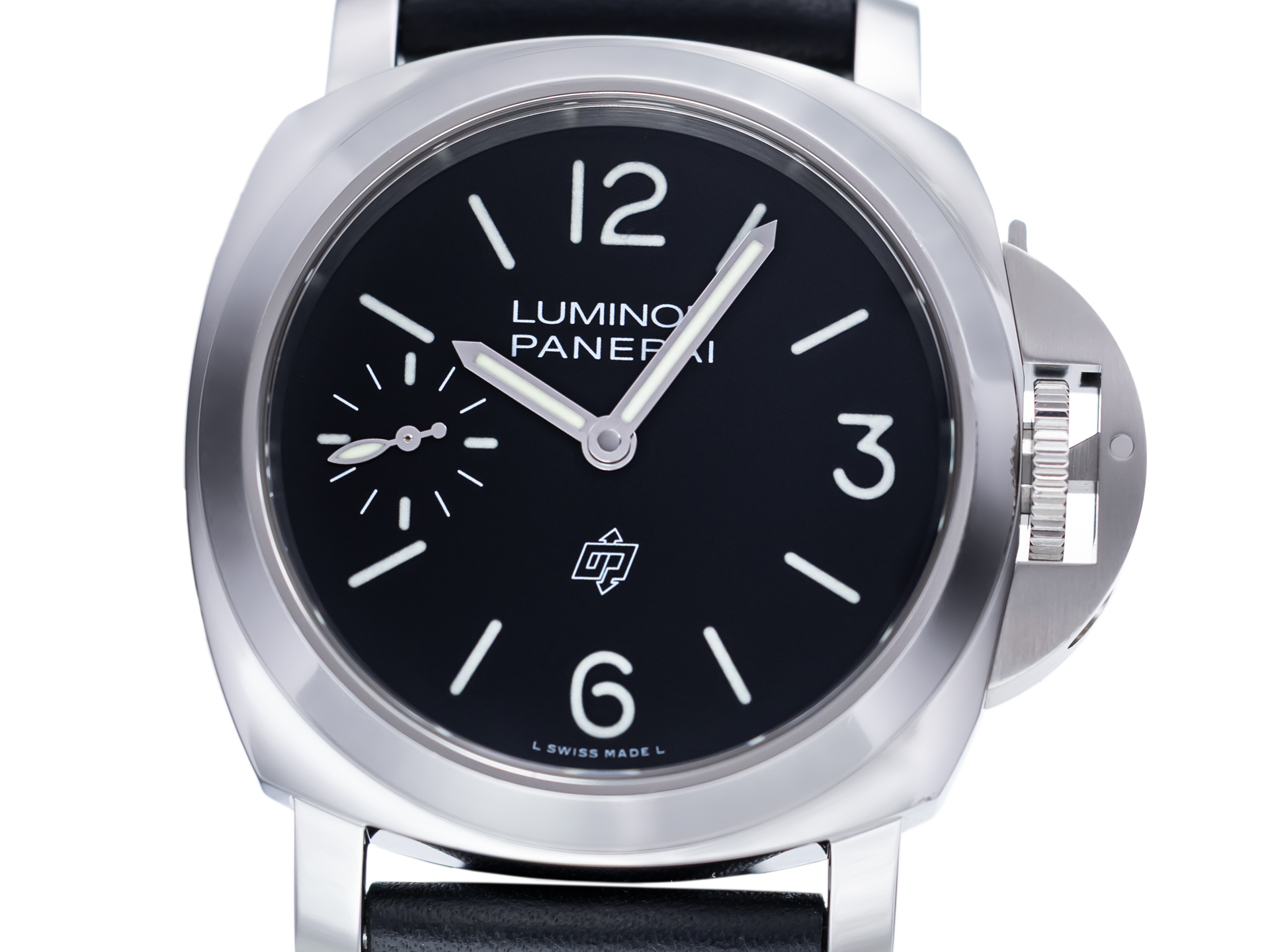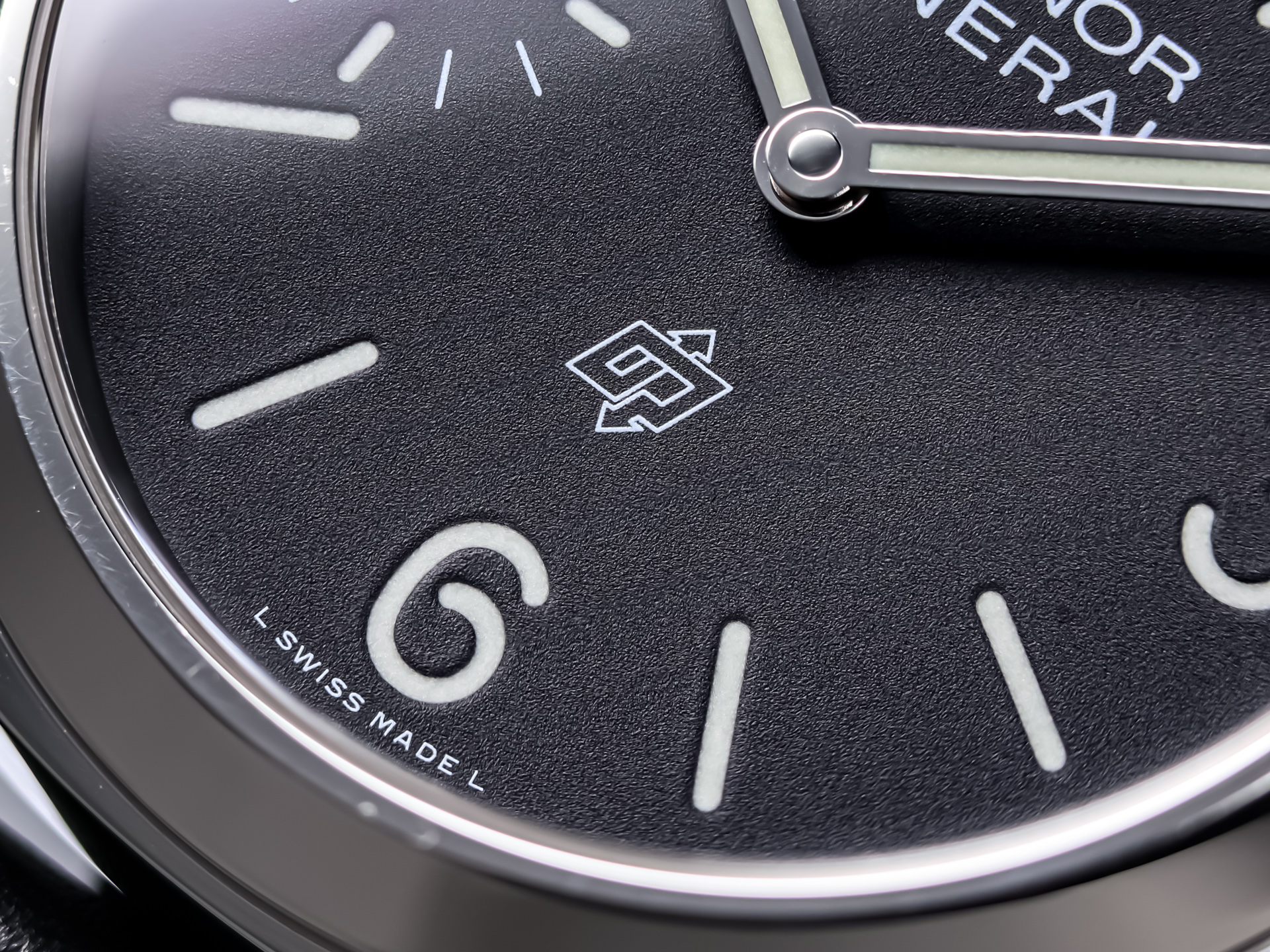 The matte black dial follows the traditional Base Logo layout, offering a clean two-hand display with bold luminous Arabic numerals and indices for exceptional legibility. The white OP (Officine Panerai) logo above 6 o’clock adds a touch of heritage, linking the design to the historic roots of the brand.