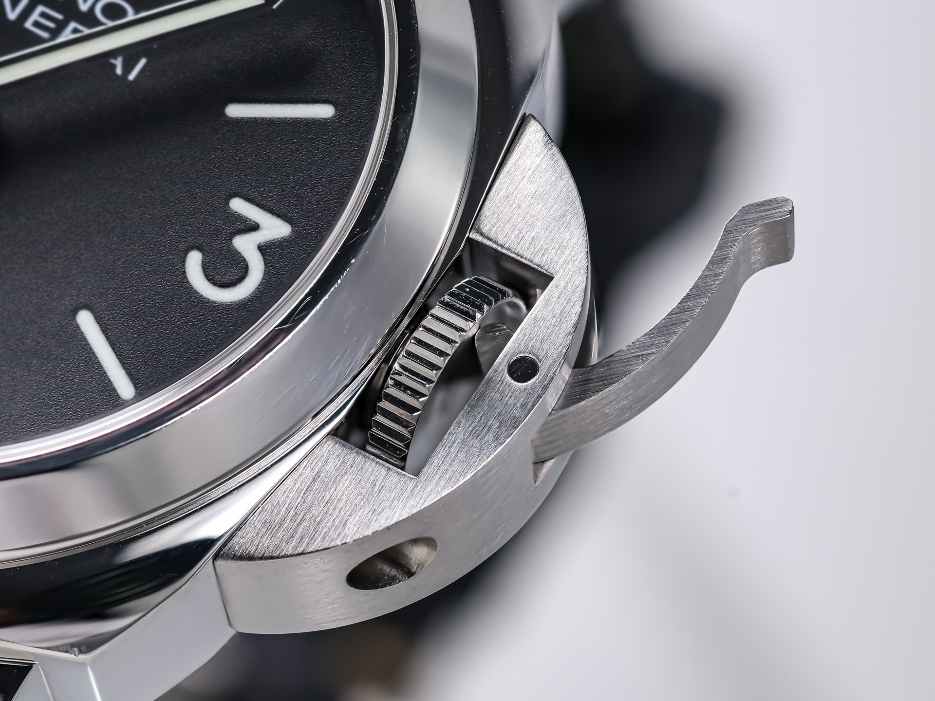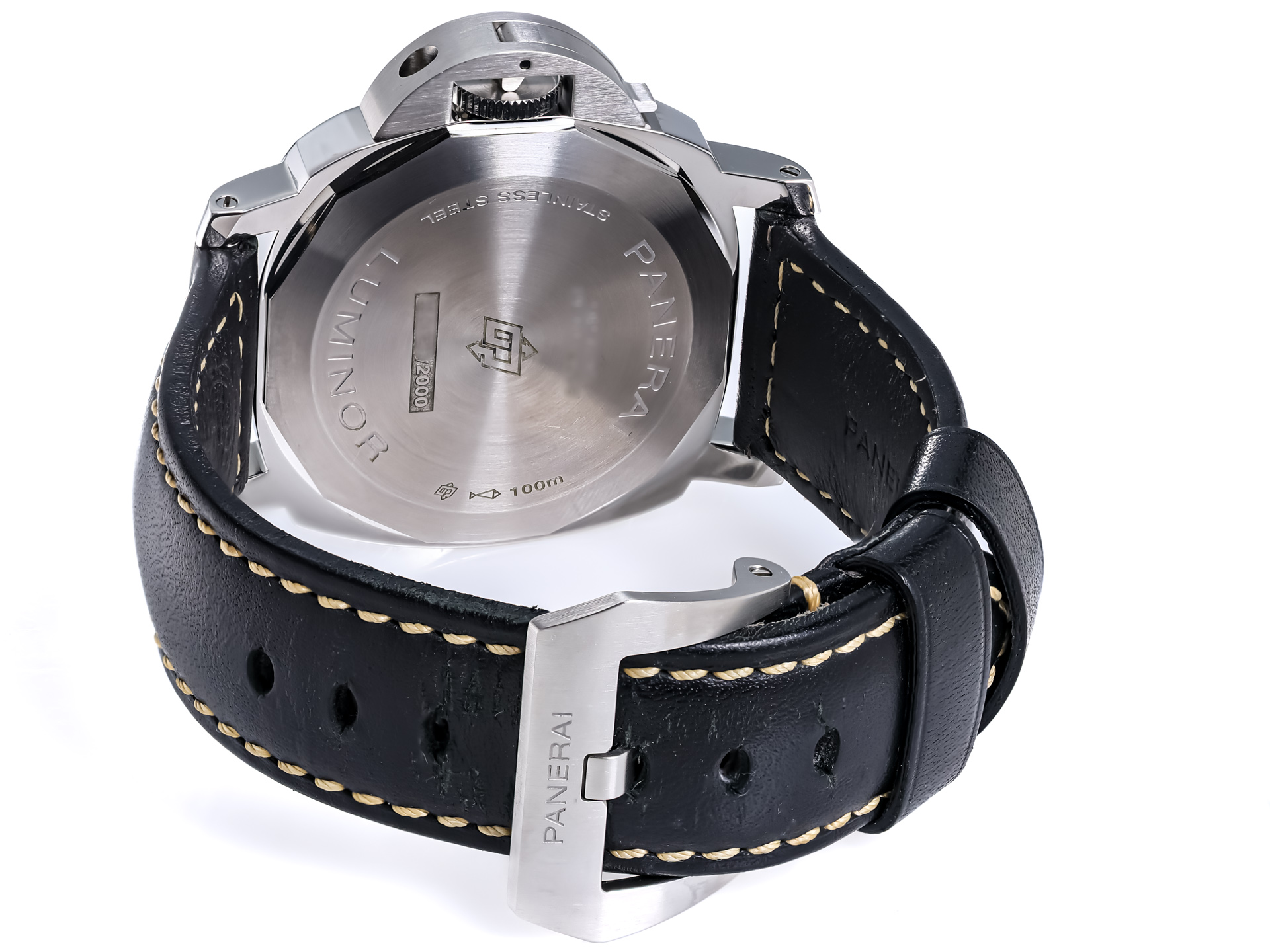 Crafted from brushed stainless steel, the 44 mm Luminor case showcases the unmistakable cushion profile and the iconic crown-protecting bridge—an engineering hallmark that has defined Panerai since its early military origins. The substantial yet balanced proportions ensure unmistakable wrist presence while maintaining everyday wearability.