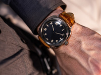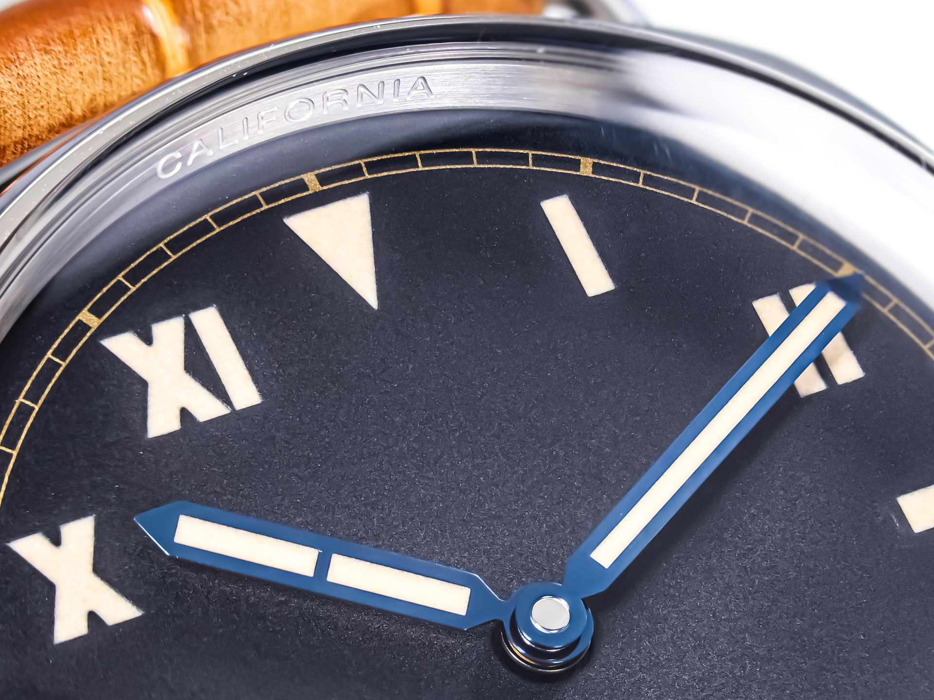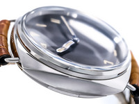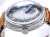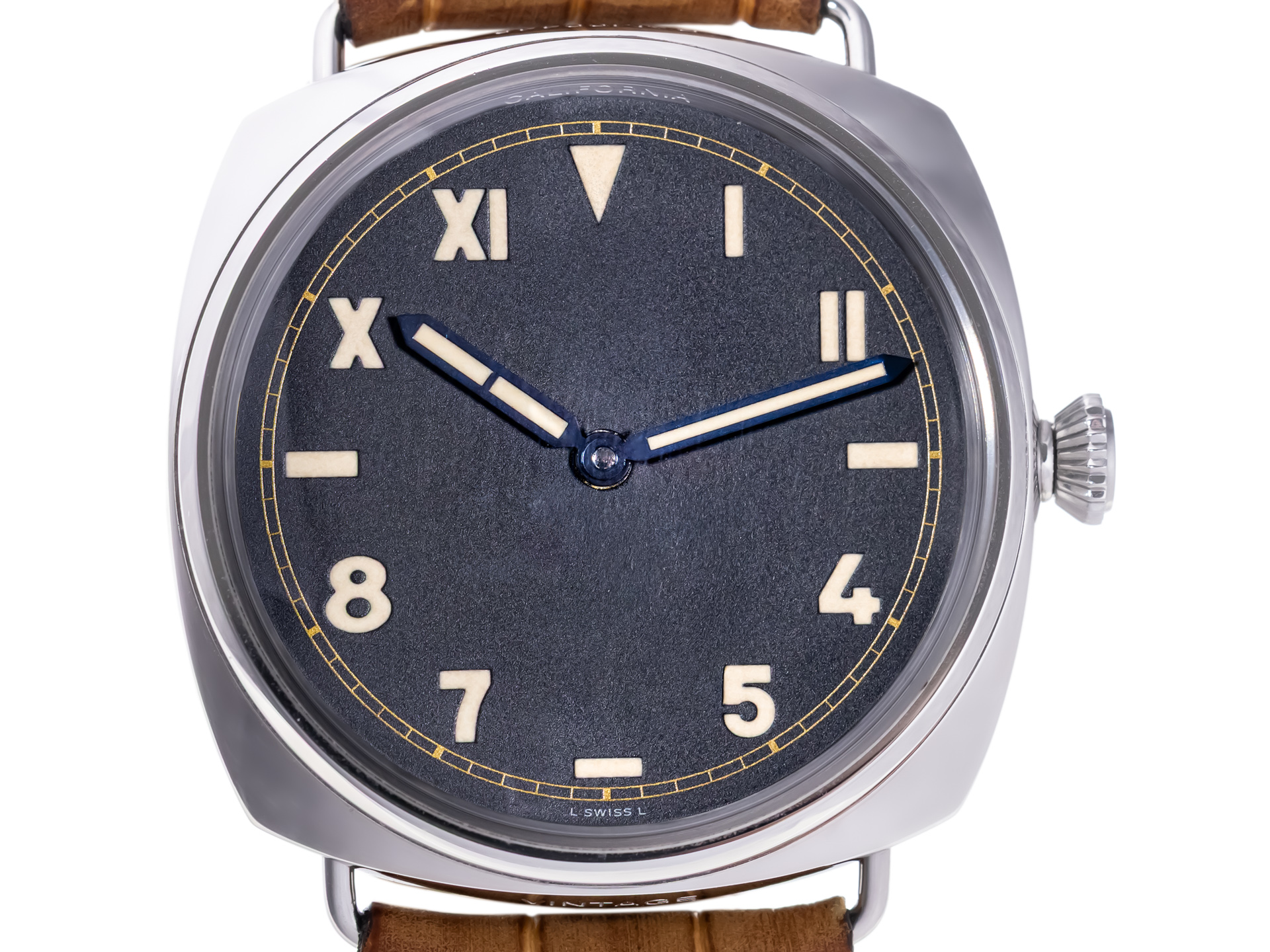 The 47mm polished stainless steel cushion case, paired with the iconic wire lugs, reflects the authentic Radiomir silhouette. Its black sandwich dial features the unmistakable California layout, combining Roman numerals, Arabic numerals, and baton markers, all coated with vintage-colored Super-LumiNova that evokes the aged radium of the originals.