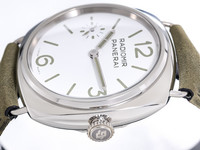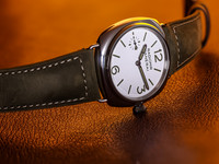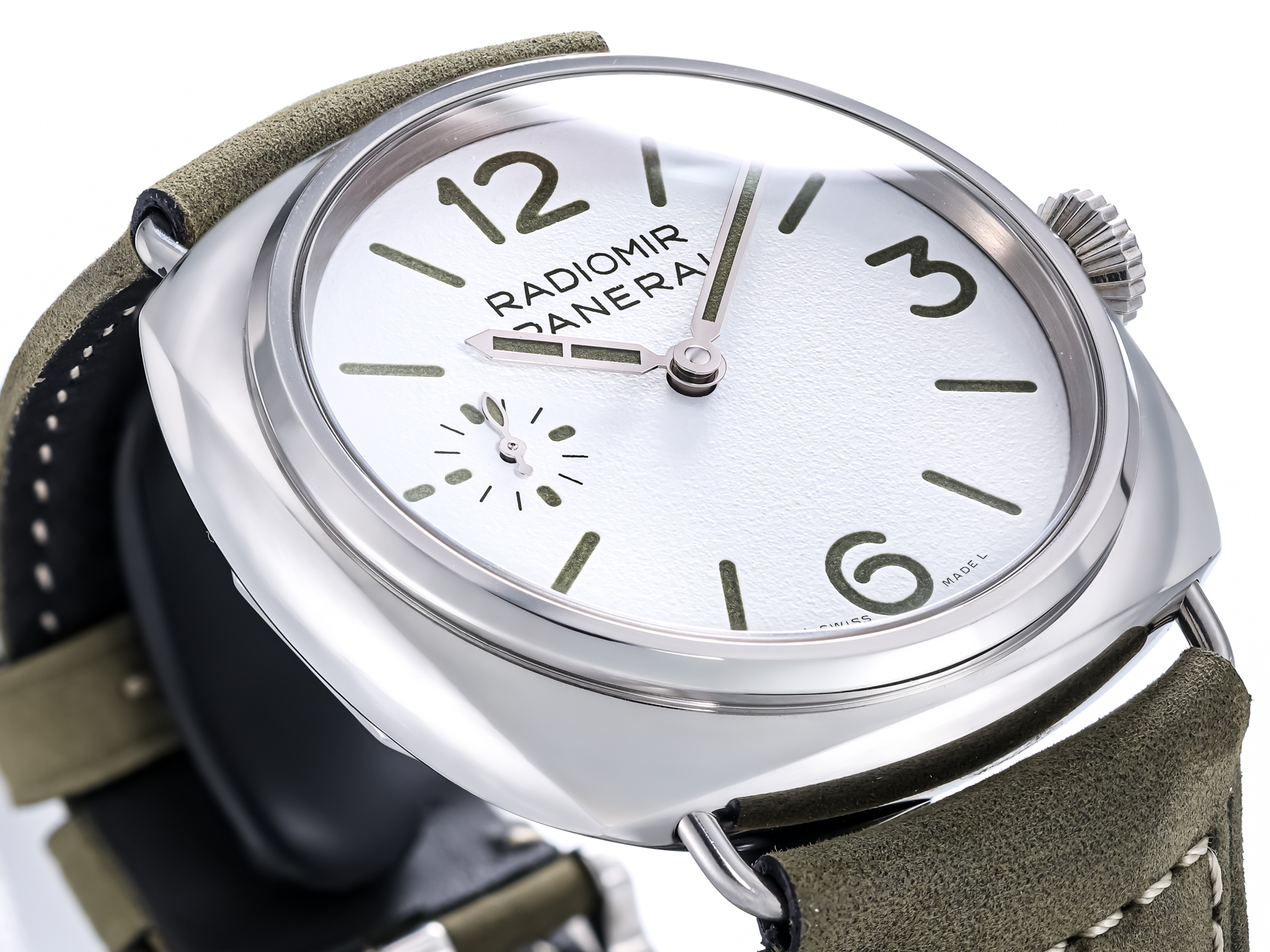The crisp white dial provides a striking contrast to the case, offering a clean and highly legible display. Featuring classic Arabic numerals and minimalist hour markers, the dial embodies Panerai’s functional aesthetic, enhanced by luminous hands for optimal readability.