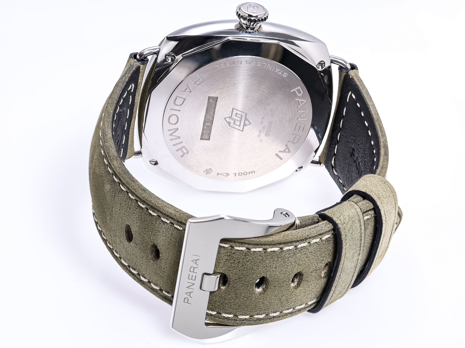 The cushion-shaped case, with its signature wire lugs and polished finish, reflects the timeless elegance that defines the Radiomir line. Its balanced proportions ensure a comfortable fit on the wrist while maintaining a strong and unmistakable presence.