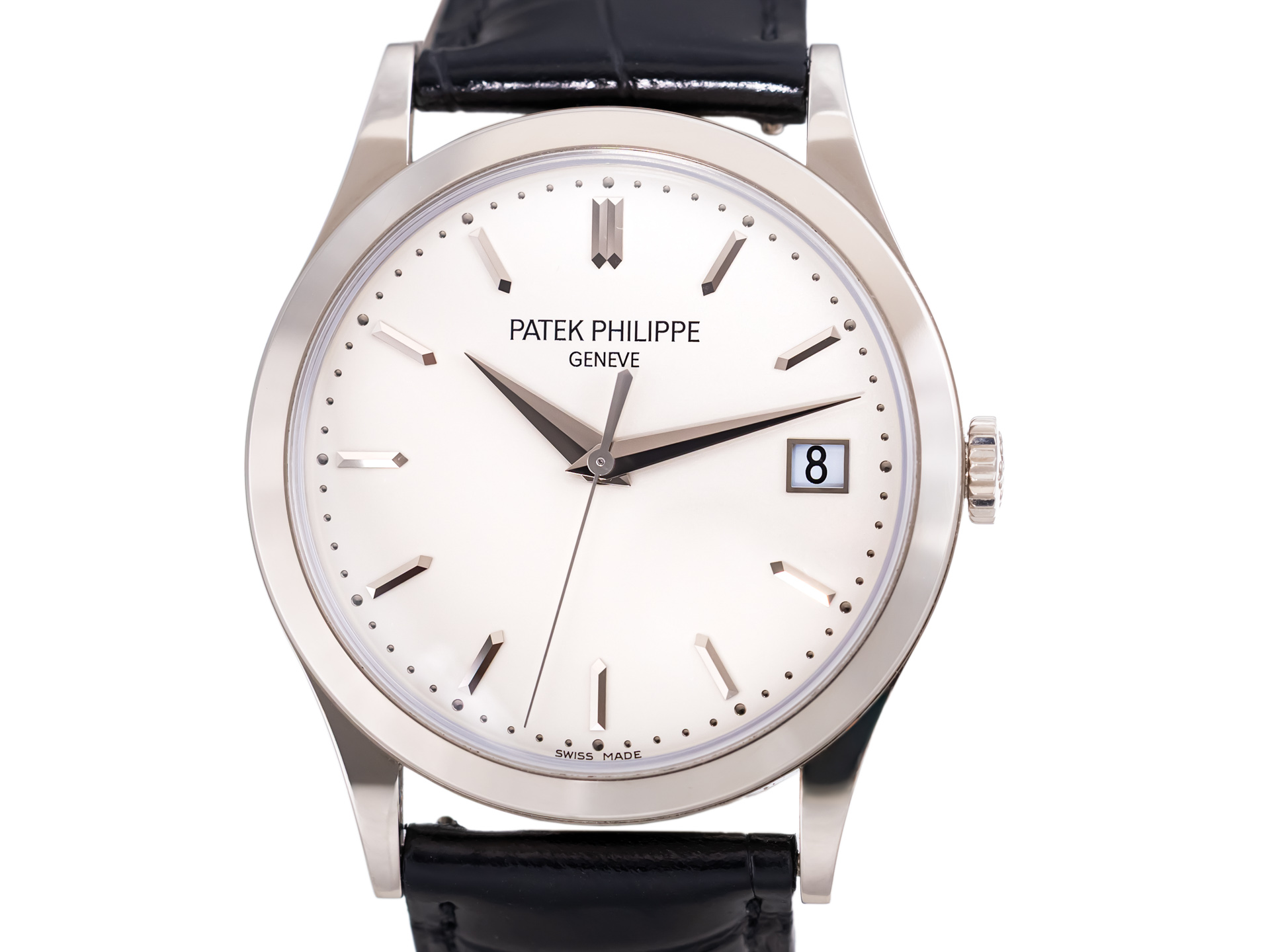 We are proud to present this elegant Patek Philippe Calatrava Ref. 5296G-010, crafted in 18k white gold with black crocodile strap anbd its white gold pin buckle.