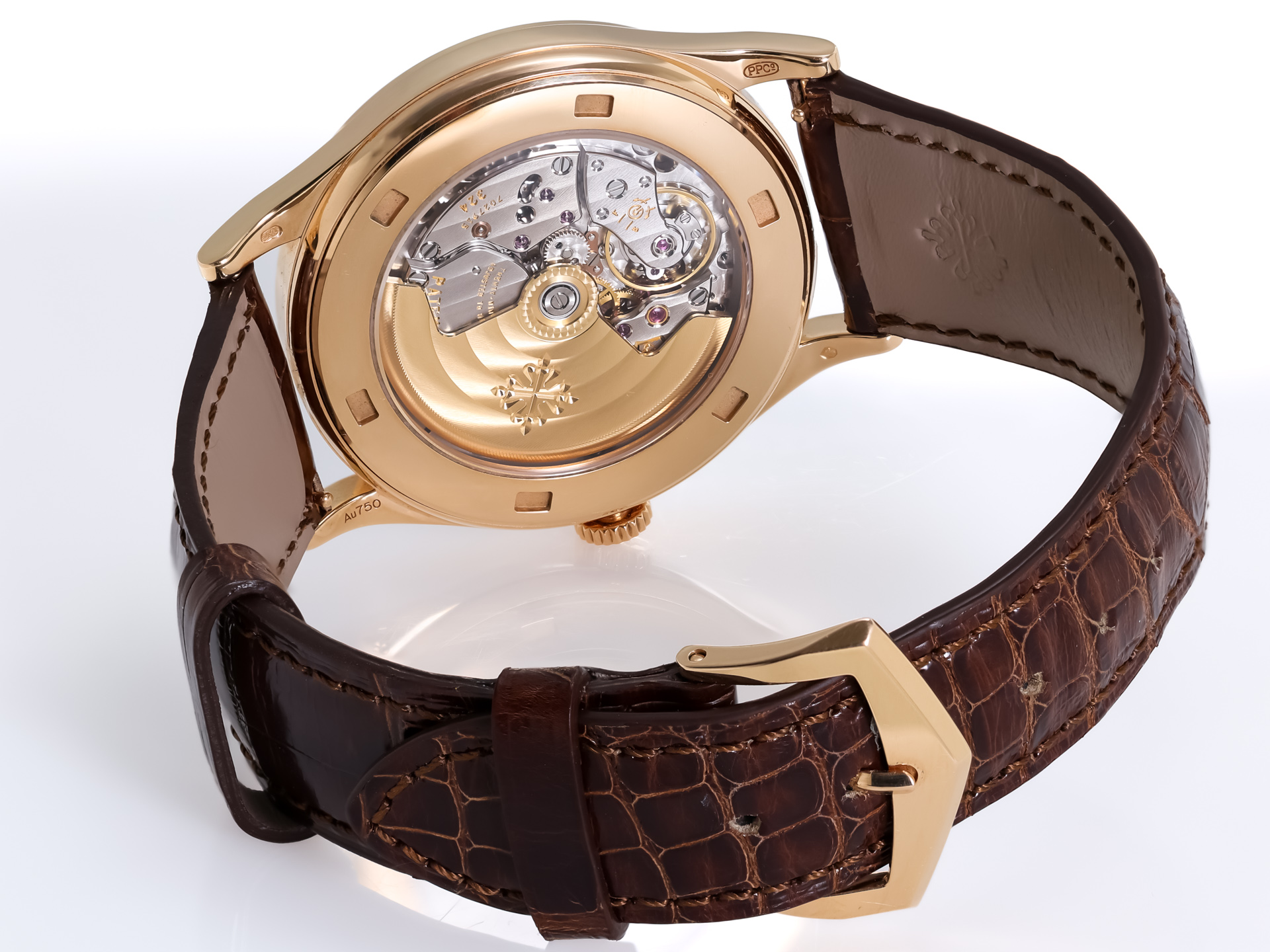 Powering the timepiece is Patek Philippe’s automatic in-house caliber 324 SC, visible through the sapphire caseback, showcasing exceptional decoration and technical excellence consistent with the brand’s uncompromising standards.