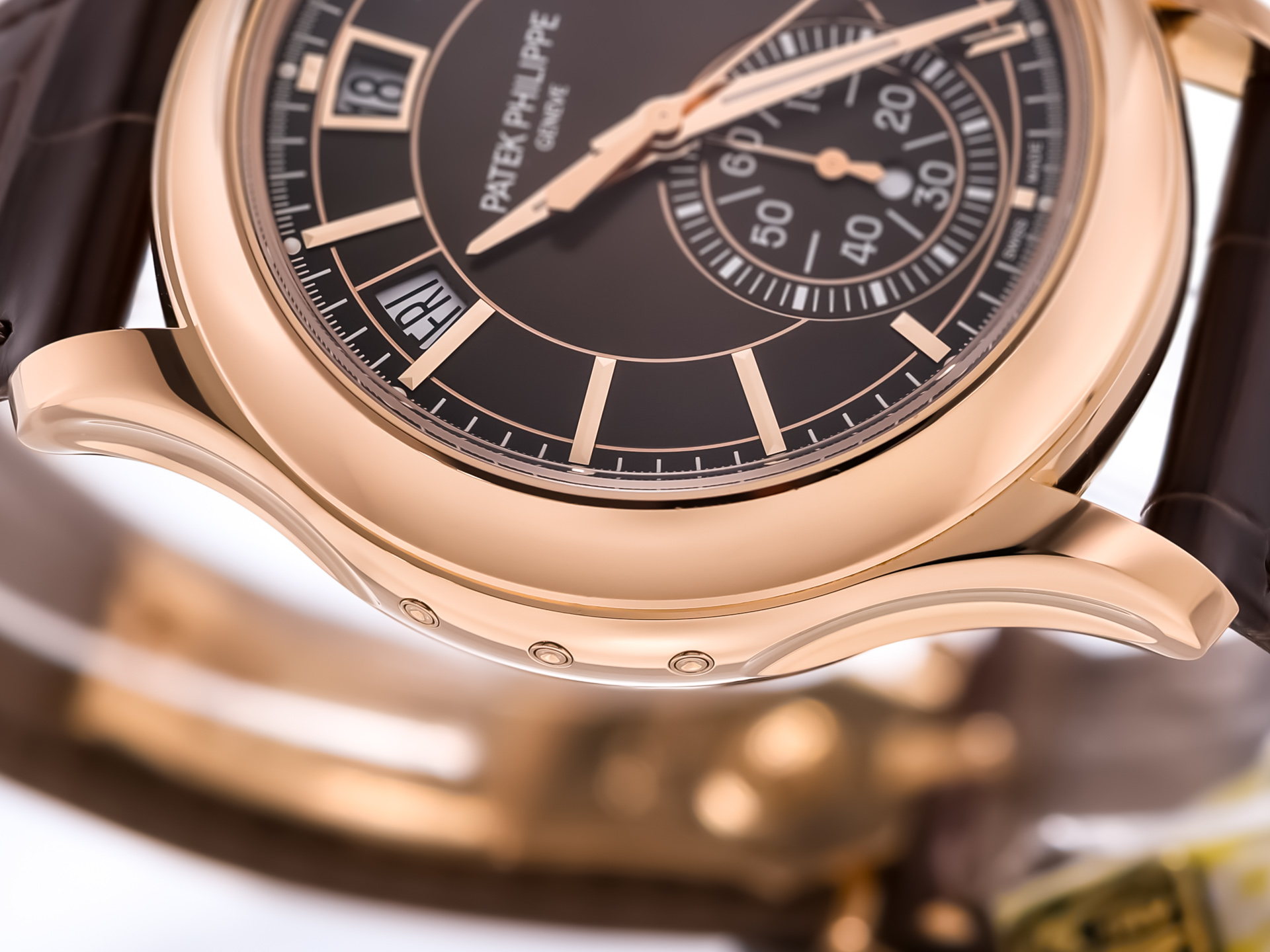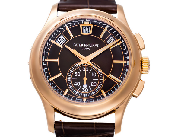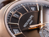Its stunning sunburst brown dial transitions gracefully to black toward the periphery, enhancing depth and legibility. The dial layout is superbly symmetrical: the day, date, and month apertures are displayed along the upper arc, while the 60-minute chronograph counter occupies the lower register — a hallmark of Patek Philippe’s meticulous sense of proportion.