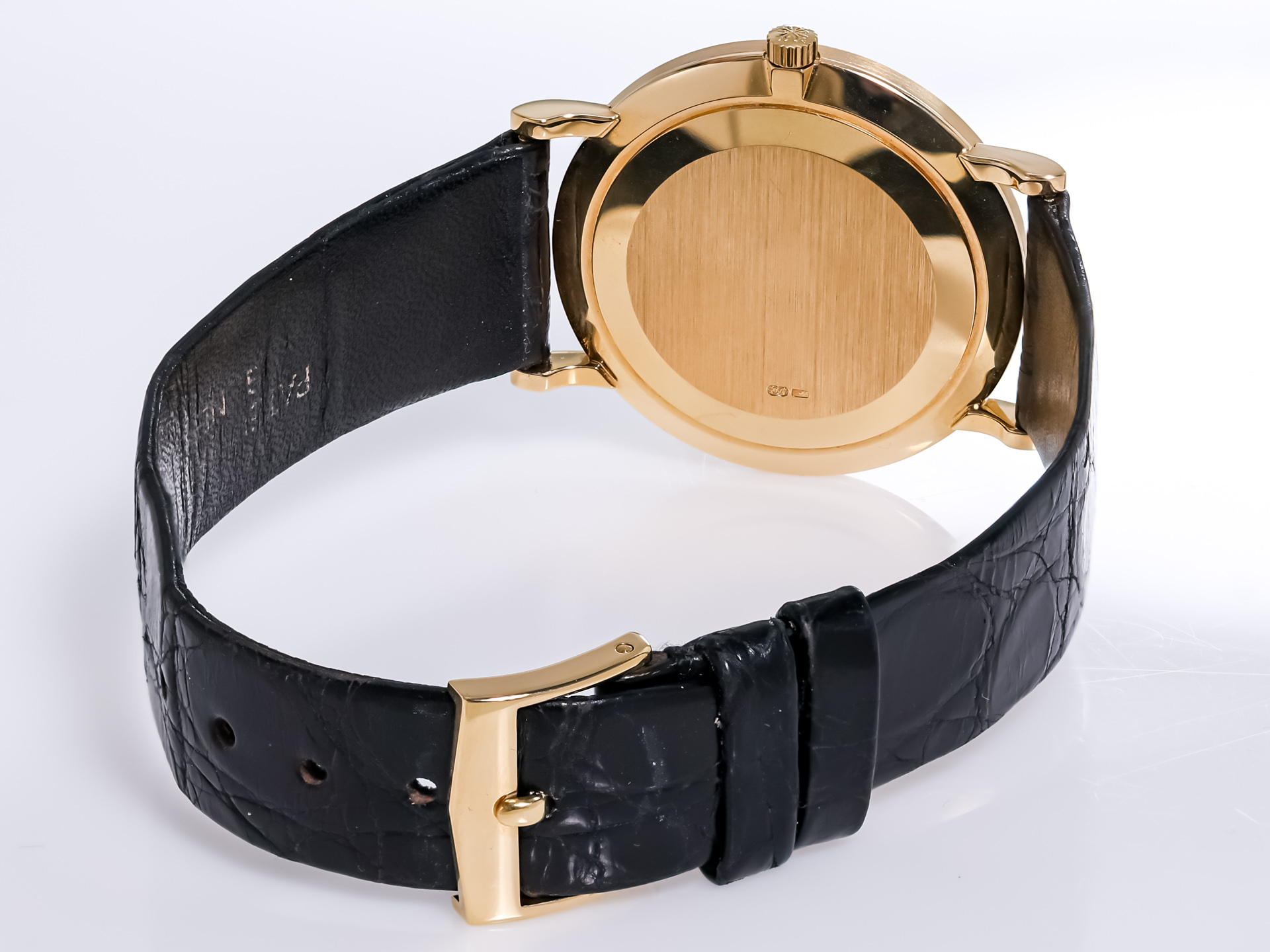 This example, from first ownership, remains in excellent condition, with well-preserved case lines, a clean bezel pattern, and made in 18k yellow gold. Paired with the original alligator strap and the original vintage 18k yellow-gold Patek Philippe pin buckle, the watch maintains its full elegance and original character.