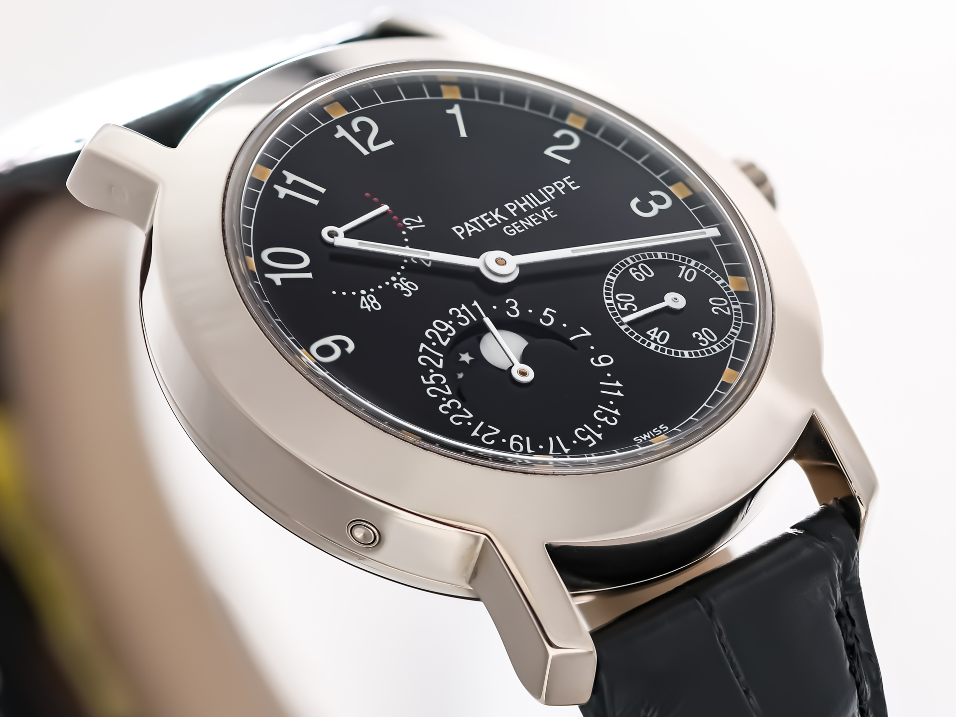 We can offer you this excellent PATEK PHILIPPE CALATRAVA POWER RESERVE MOON ref. 5055G-001 in 18k white gold on brown leather strap and white gold folding clasp.