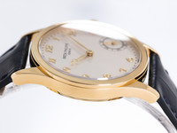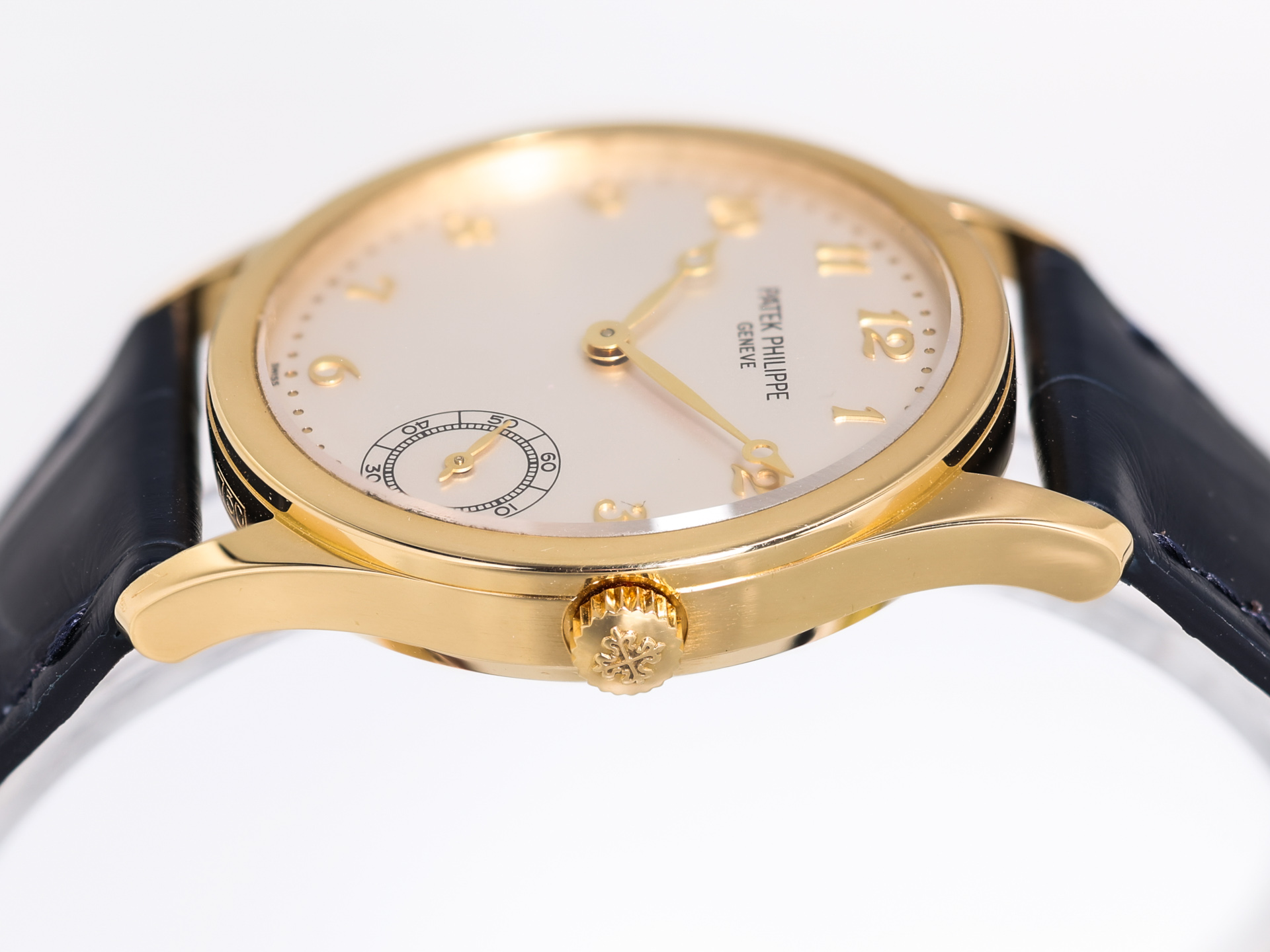 The highlight of this reference is its exquisite silvered opaline dial, adorned with applied gold Breguet numerals and elegant leaf-shaped hands, lending the piece a touch of vintage-inspired charm. A small seconds sub-dial at 6 o’clock adds both functionality and perfect visual harmony — a signature of Patek Philippe’s mastery of subtle detail.