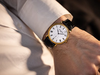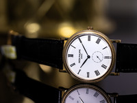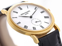The Ref. 5119J features the iconic hobnail “Clous de Paris” bezel, a hallmark design element that has defined some of the most enduring Calatrava references. Its 36mm yellow-gold case offers refined proportions, with slender lugs and a timeless profile that lends the watch an effortlessly understated presence. The white lacquered dial, with black Roman numerals and leaf-shaped hands, presents exceptional clarity while recalling the aesthetic codes of mid-century Patek Philippe dress watches.