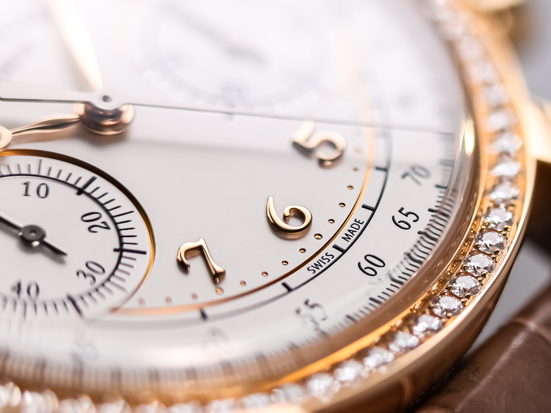 The silver opaline dial is a masterpiece of balanced elegance, featuring Breguet numerals, finely sculpted leaf hands, and subtle chronograph counters that preserve perfect symmetry. The aesthetic evokes vintage Patek charm while remaining distinctly modern and feminine.