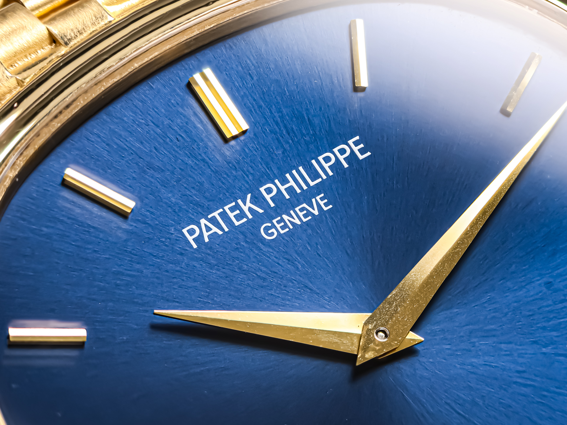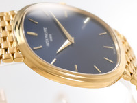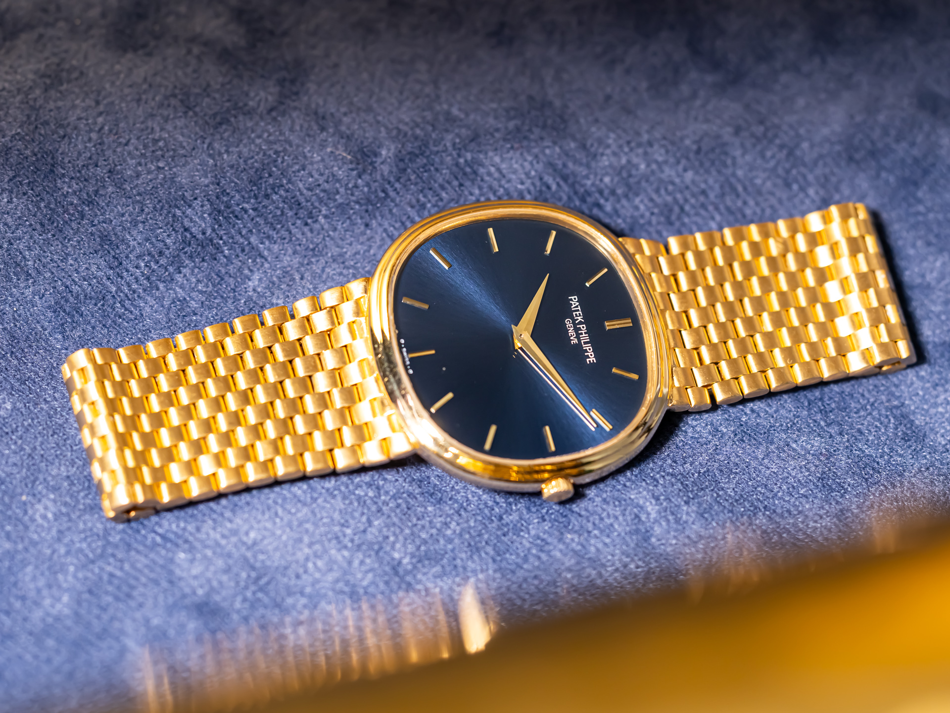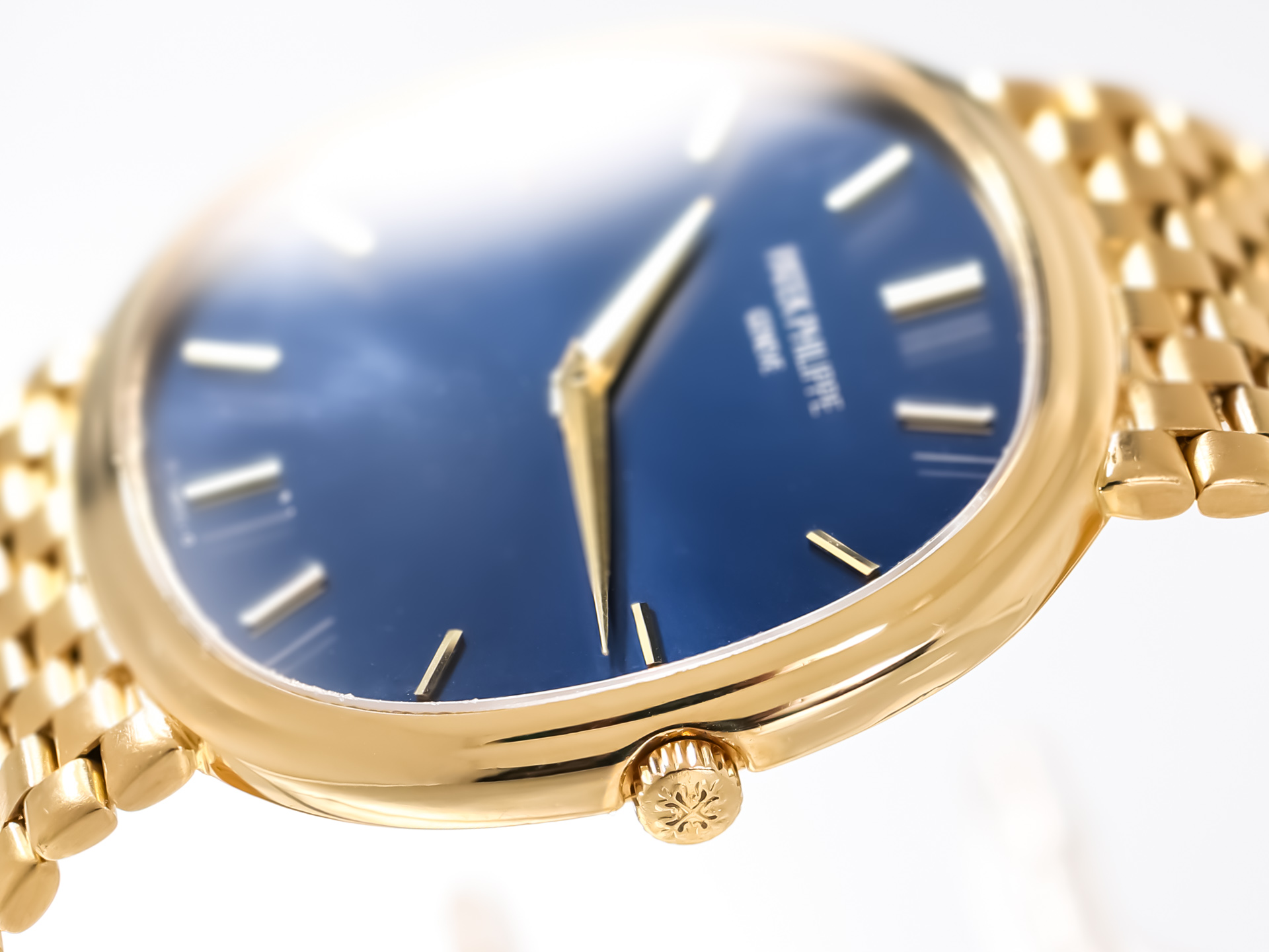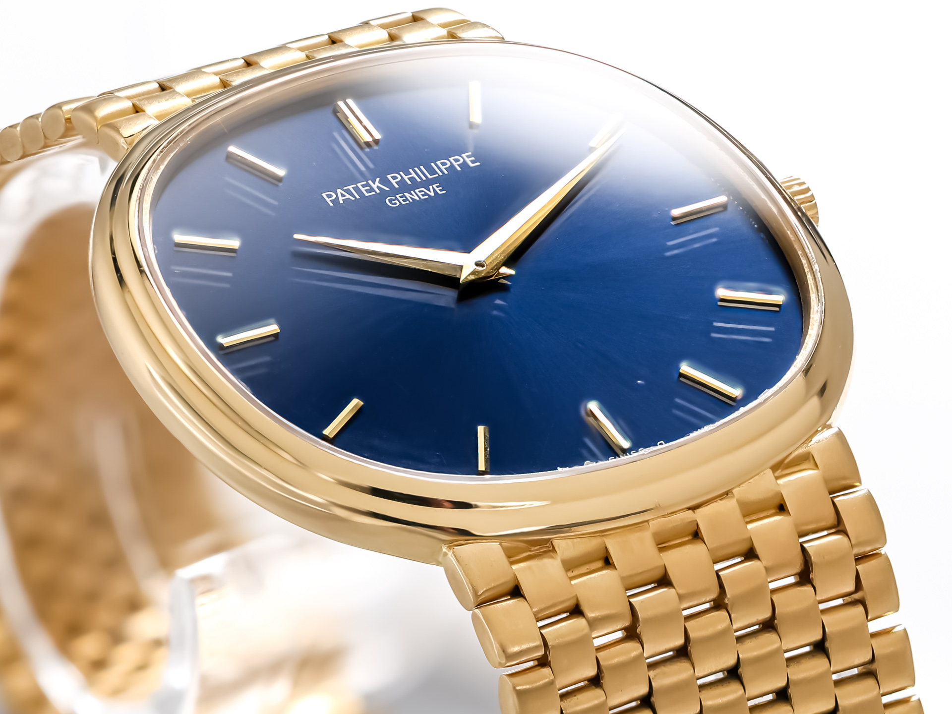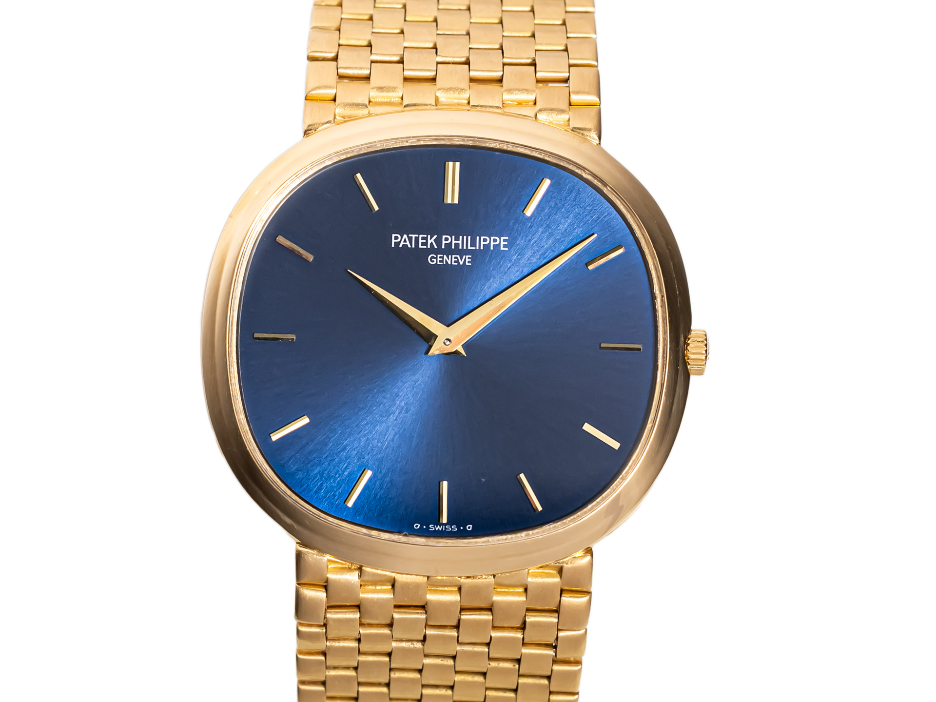 The deep blue sunburst dial — free of numerals and beautifully balanced by slender white-gold baton hands — allows the elliptical geometry to speak for itself. This calm, architectural design language remains one of the most celebrated philosophies in Patek’s history.