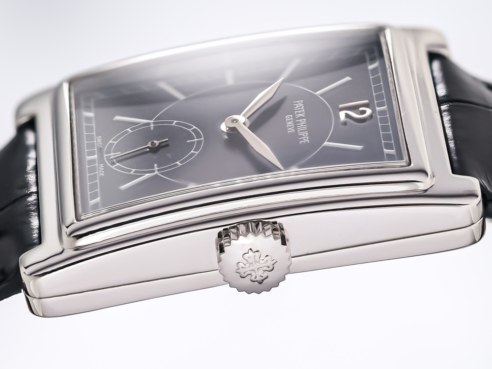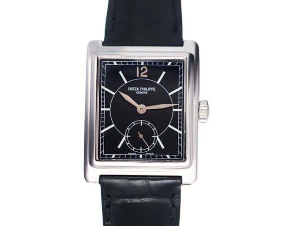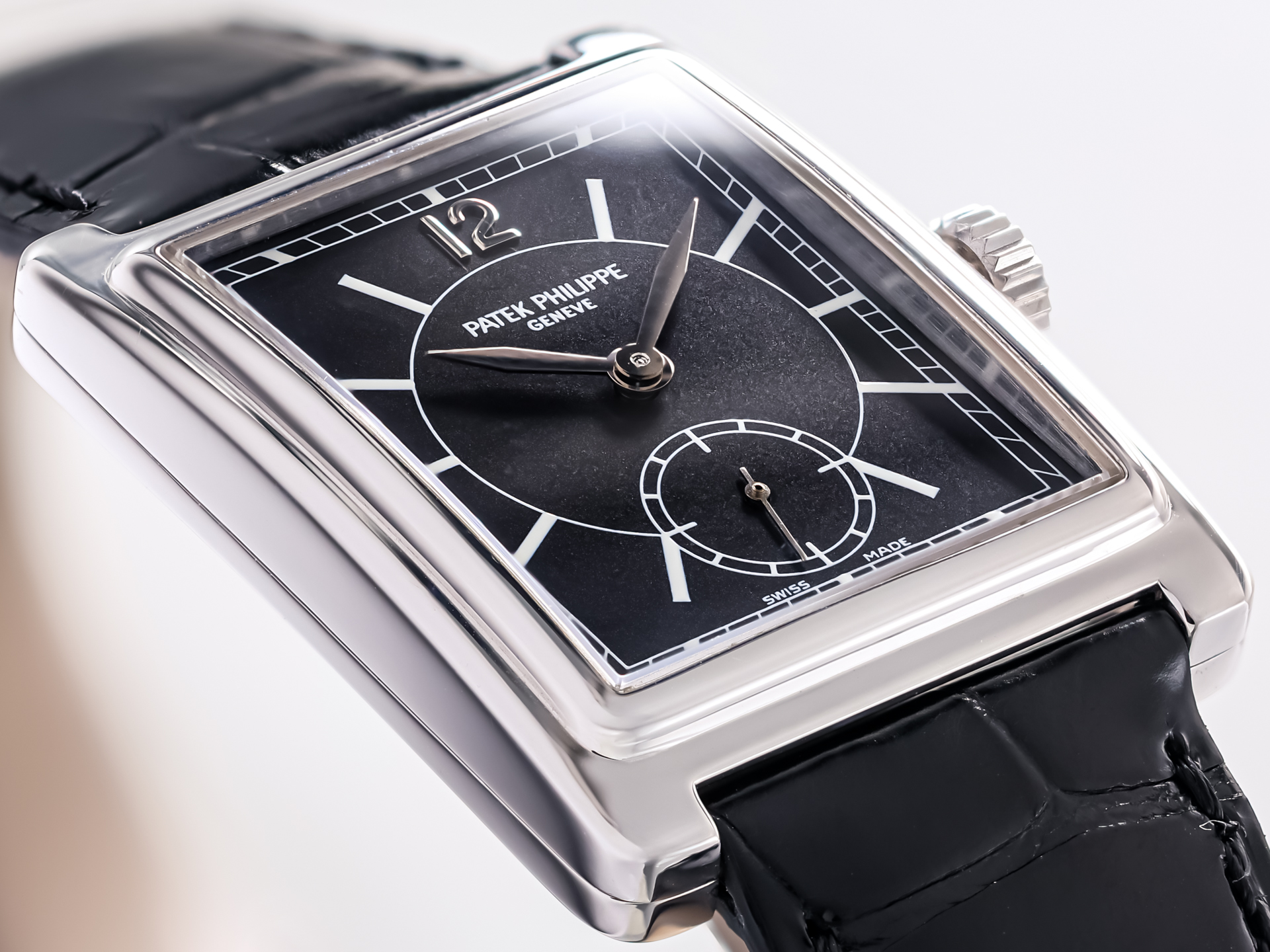 The watch features a signature Patek Philippe noir black dial, highlighted by a contrasting white gold Arabic “12” at 12 o’clock, white lacquered hour markers, and a finely printed rail minute track. A small seconds sub-dial elegantly positioned in the lower half of the dial adds balance and functionality, while enhancing the refined aesthetic of the timepiece. The combination of black and white gold creates a visually striking, yet classically understated look - an emblem of Patek Philippe’s enduring design language.