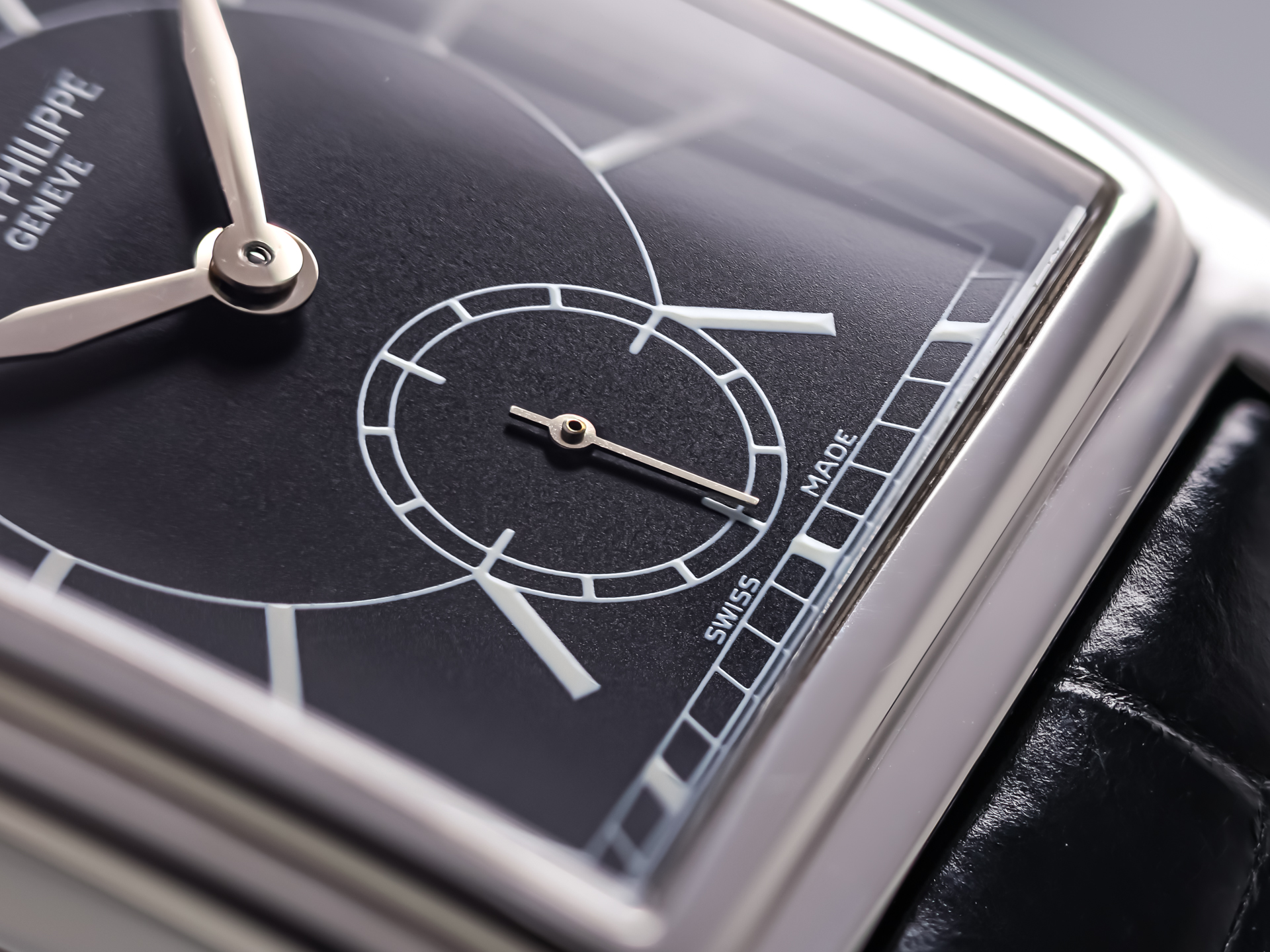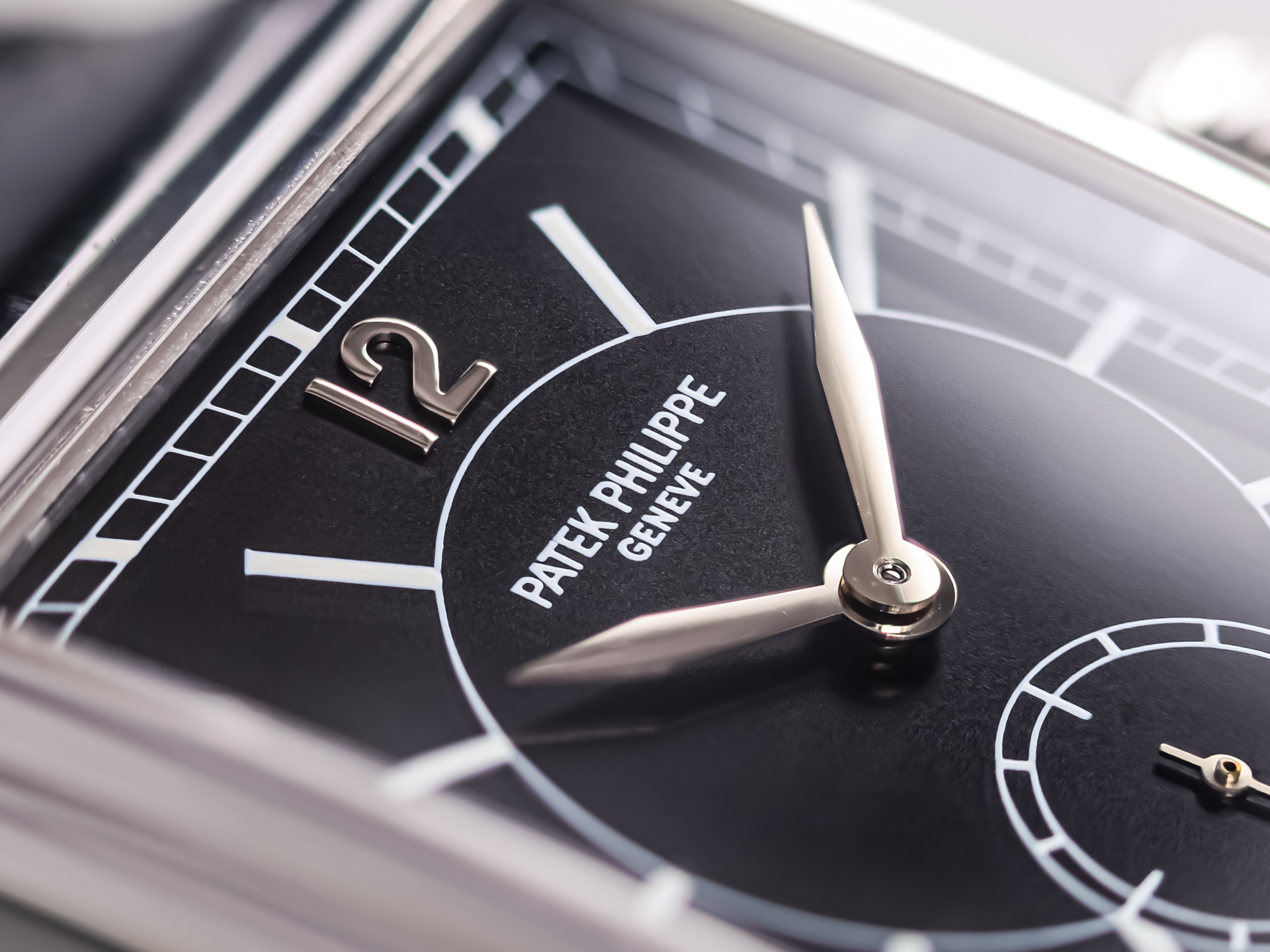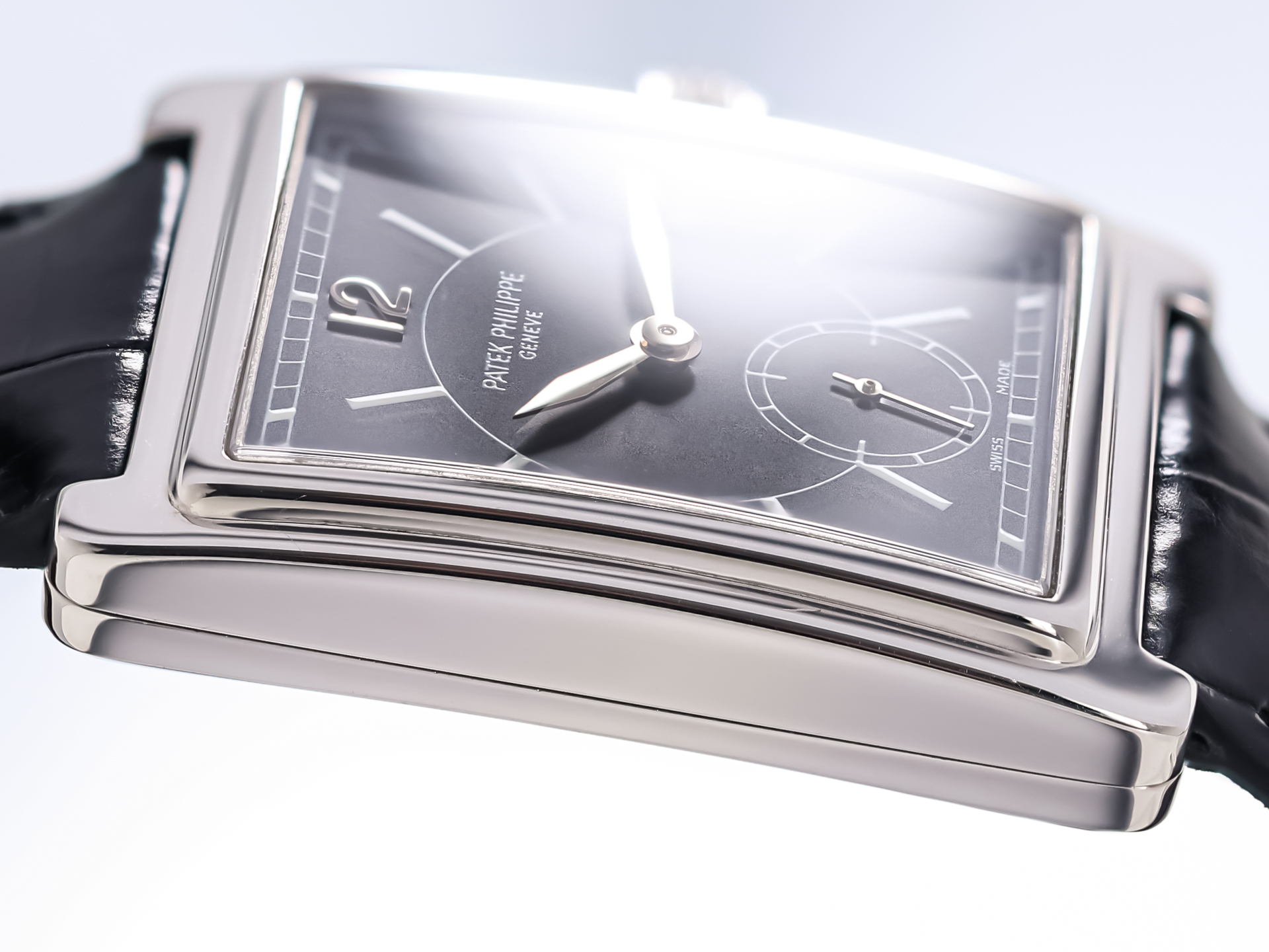 The watch features a signature Patek Philippe noir black dial, highlighted by a contrasting white gold Arabic “12” at 12 o’clock, white lacquered hour markers, and a finely printed rail minute track. A small seconds sub-dial elegantly positioned in the lower half of the dial adds balance and functionality, while enhancing the refined aesthetic of the timepiece. The combination of black and white gold creates a visually striking, yet classically understated look - an emblem of Patek Philippe’s enduring design language.