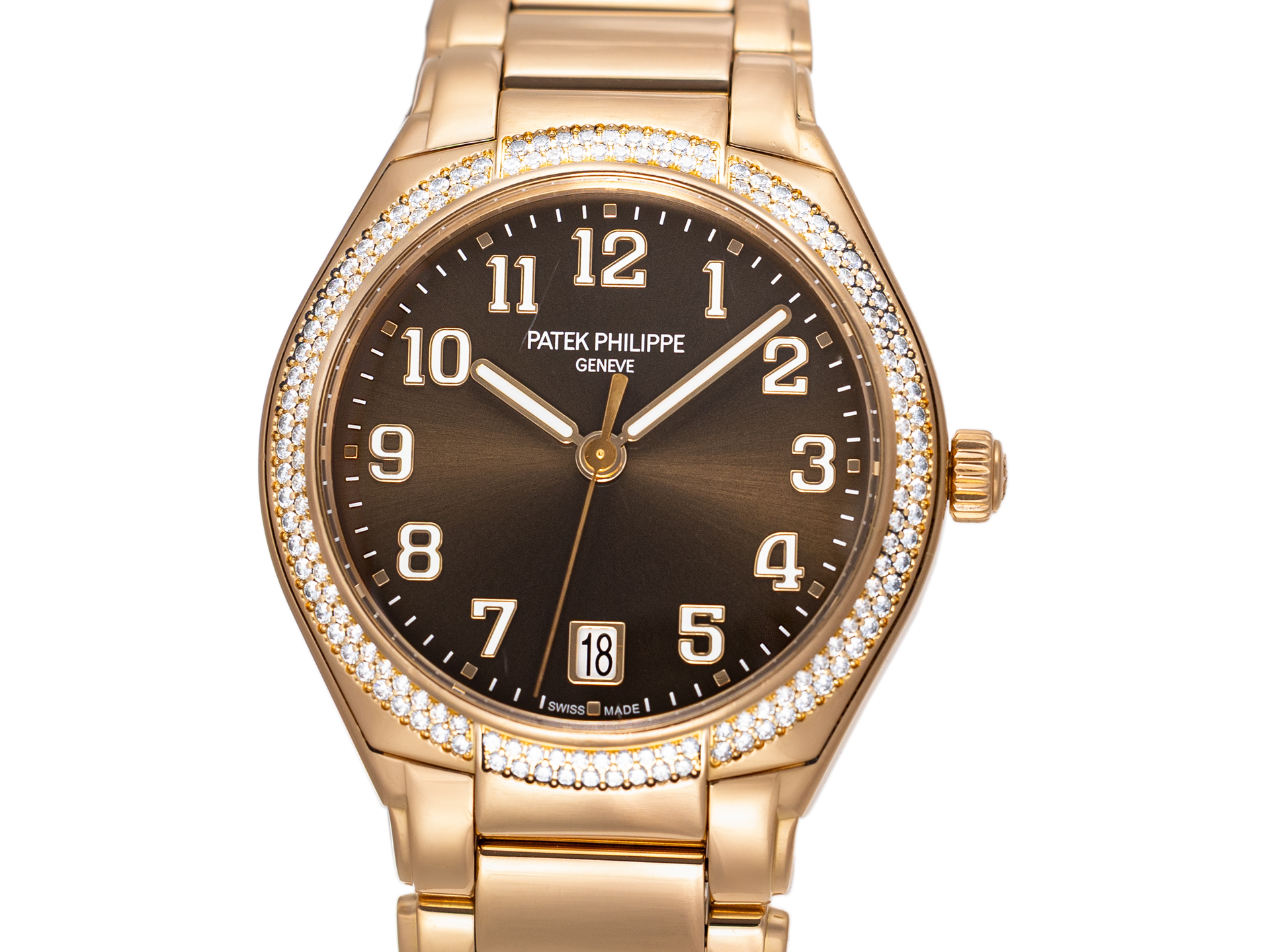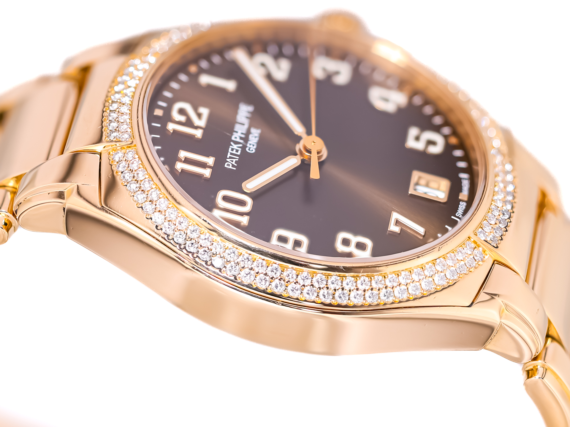 The watch is adorned with an impressive 160 original Patek Philippe diamonds, totaling 0,813 carats, meticulously set to enhance brilliance while maintaining perfect harmony with the case and bracelet.